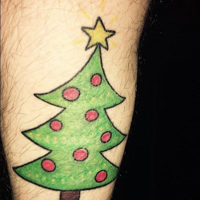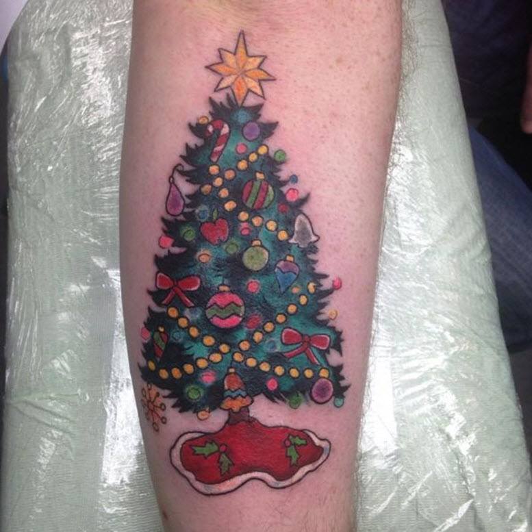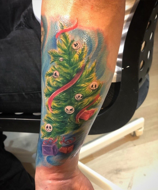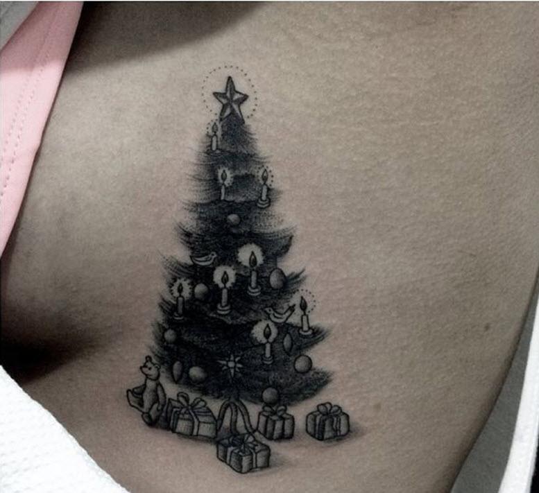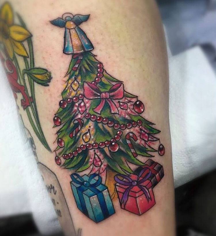 Le tatouage de sapin décoré avec des jouets du Nouvel An et des guirlandes est magnifique et original. En plus du fait qu'un tel tatouage vous rappellera toujours les vacances et le plaisir, il indiquera également la disposition gaie, la romance et la gaieté de son propriétaire. De plus, l’arbre du Nouvel An symbolise un certain commencement, puisque le symbole d’un nouveau commencement est appliqué au corps.