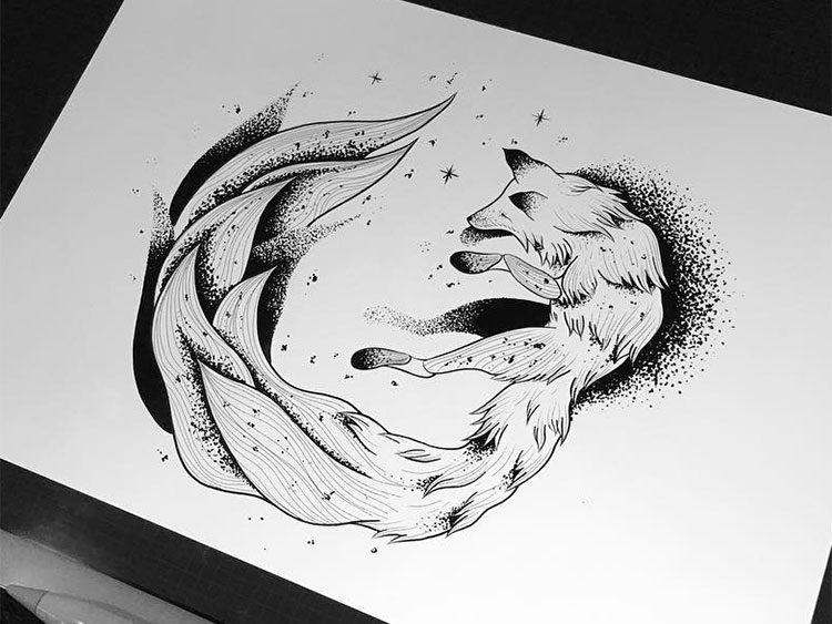 Certains tatouages de renard ont effectué dans une teinte noire. On pense que cette option d'application de l'ornement est capable de transmettre toutes les lignes et le caractère distincts de l'animal carnivore. Dans certains cas, les lignes noires sont complétées par une teinte rouge. Fondamentalement, cette combinaison d'orange et de noir est utilisée lors d'un tatouage avec des éléments géométriques. Dessiner dans une nuance noire fait référence au style monochrome. Les éléments ethniques sont parfois autorisés dans cette composition.