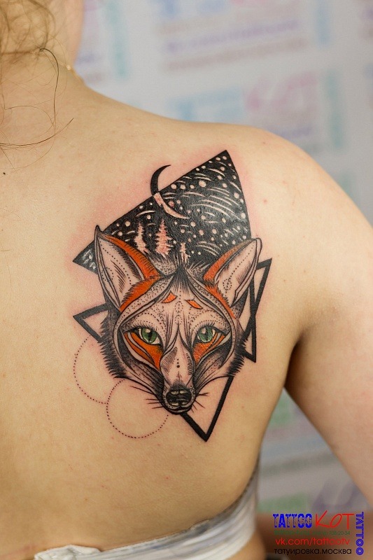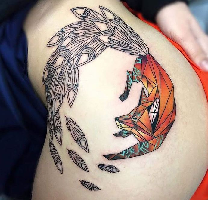 Ce style nous est connu par l'art du Japon. Tout le monde sait depuis longtemps que l'origami est la mise en œuvre de différentes figures à partir de papier ordinaire. C’est cette option que les tatoueurs ont décidé d’utiliser pour la fabrication de cet ornement. Les lignes pointues du dessin donnent au tatouage de renard un aspect plutôt intéressant et inhabituel.