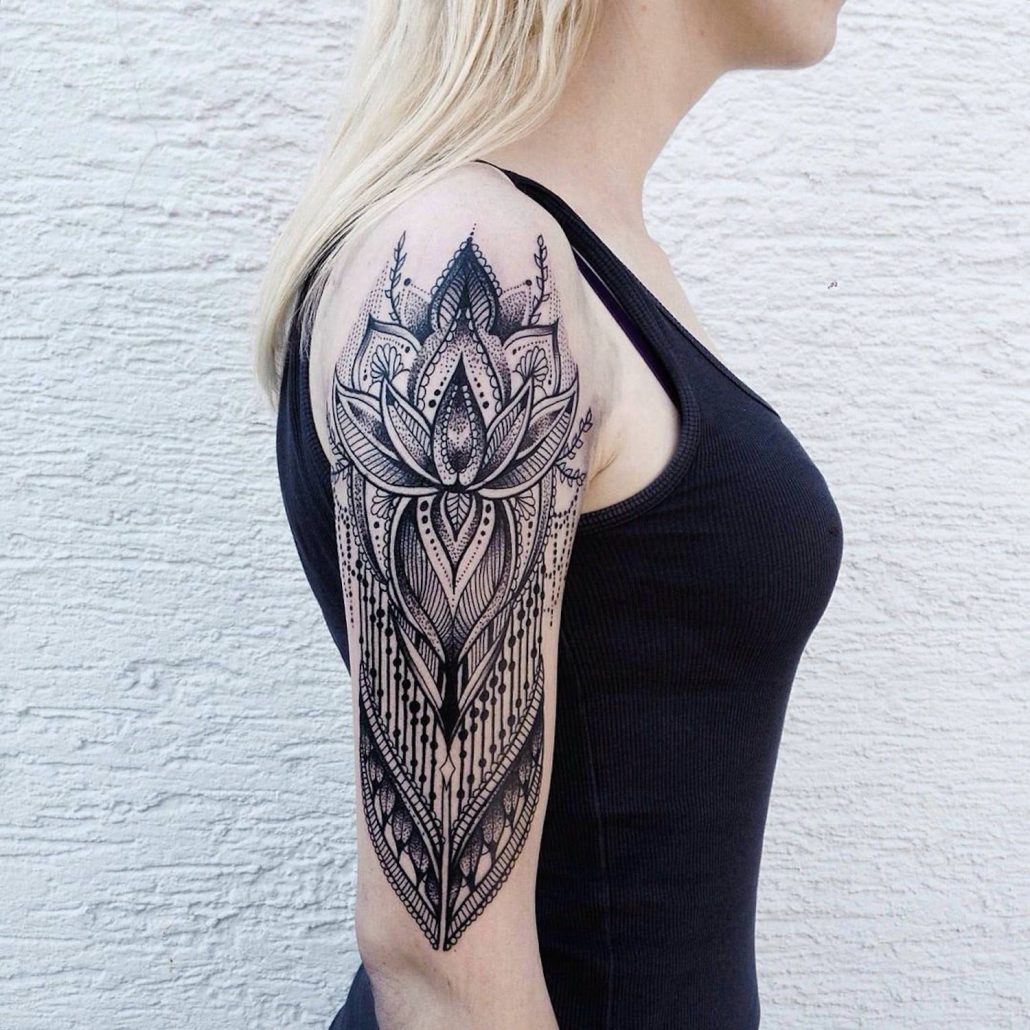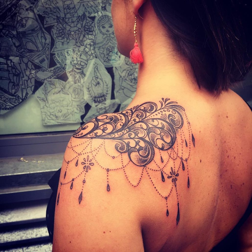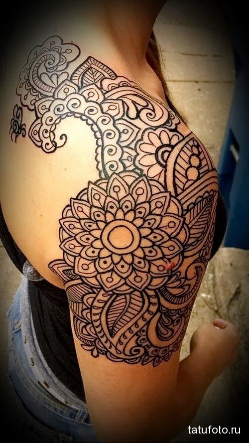Le tatouage, qui est un élément de dentelle, est purement féminin. Cette image vous permet de mettre en valeur la féminité et l'élégance. En règle générale, la dentelle sur l'épaule ne cache aucune signification, mais est simplement réalisée pour décorer un style de tatouage différent.
