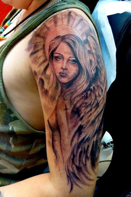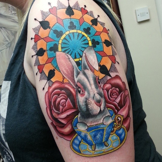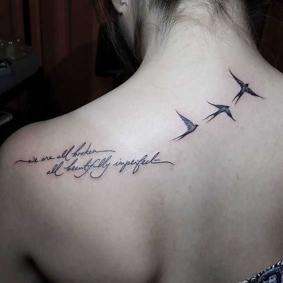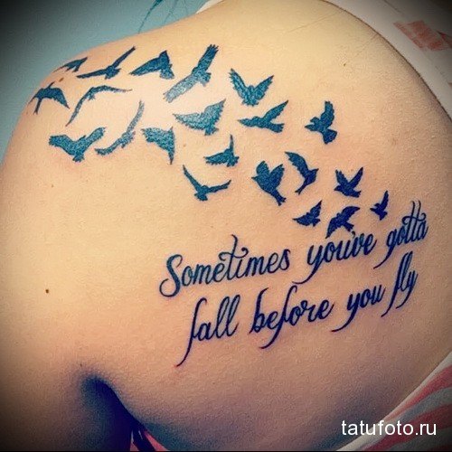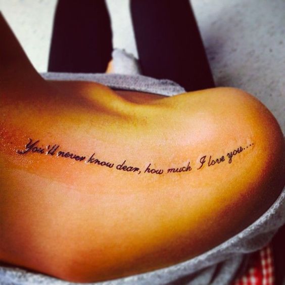 Les tatouages sous forme d'inscriptions à l'épaule sont très courants. Habituellement, ils ont une certaine connotation et signifient exactement ce qui est écrit. Pour les inscriptions de dessin, diverses polices dessinées à la main et calligraphiques sont utilisées, y compris celles inventées.
