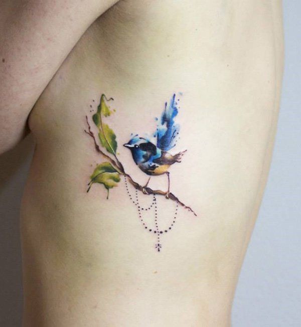 Les tatouages à l'aquarelle sont toujours colorés et attrayants. De belles peintures aux contours doux ont fière allure sur les bords. Un tel tatouage véhicule des scènes pittoresques et un flou coloré rend le dessin plus insolite et unique. Les tatouages dans le style de l'aquarelle sur les côtes sont très populaires chez les hommes et les femmes. Dans ce cas, la taille de l'image n'a pas d'importance. Tatouage volumétrique à l'aquarelle - motif attrayant et envoûtant. Mais un si petit tatouage aura aussi l’air mignon et adorable.