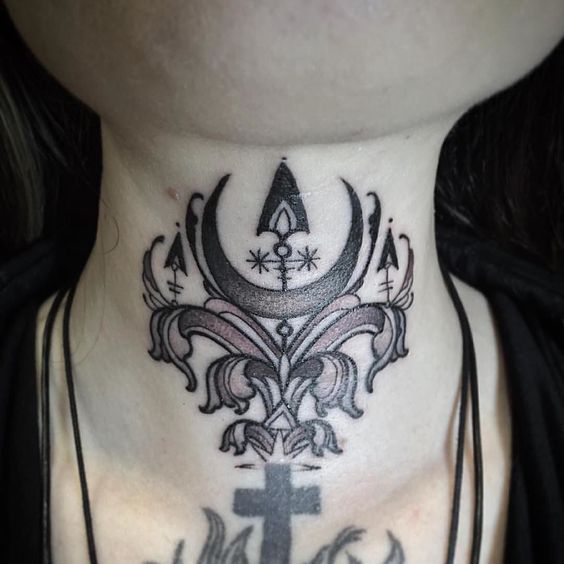 Le tatouage sur le cou devant est très fin. Un collier ou des bijoux éblouissants n’attirent pas toujours les regards curieux, mais un tatouage artistique sur un cou gracieux est un défi audacieux pour les bijoux coûteux que les filles fabriquent pour souligner leur individualité et leur unicité. Le tatouage est une philosophie entière. Un petit dessin gracieux qui exprime la profondeur du mystère et l’incompréhensibilité féminine a l’air très subtil et délicat. Cette option est utilisée même par les dames les plus modestes et les plus sensibles.