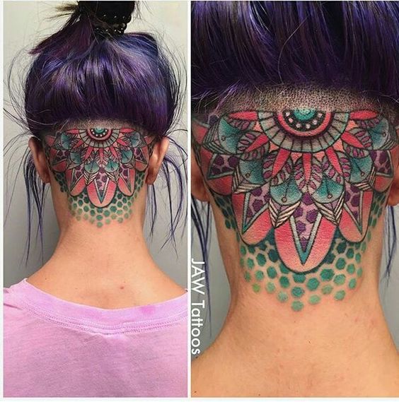 Les filles rebelles préfèrent des dessins plus impressionnants pour l'art corporel. La taille d'un tel motif peut être déterminée par l'intervalle entre le haut de la tête et la clavicule. Dans cette optique, il existe un immense espace pour l’incarnation de la pensée créatrice. Par conséquent, le choix des dessins est si vaste: créatif, scandaleux, à la mode, volumineux pour un cou féminin élégant.