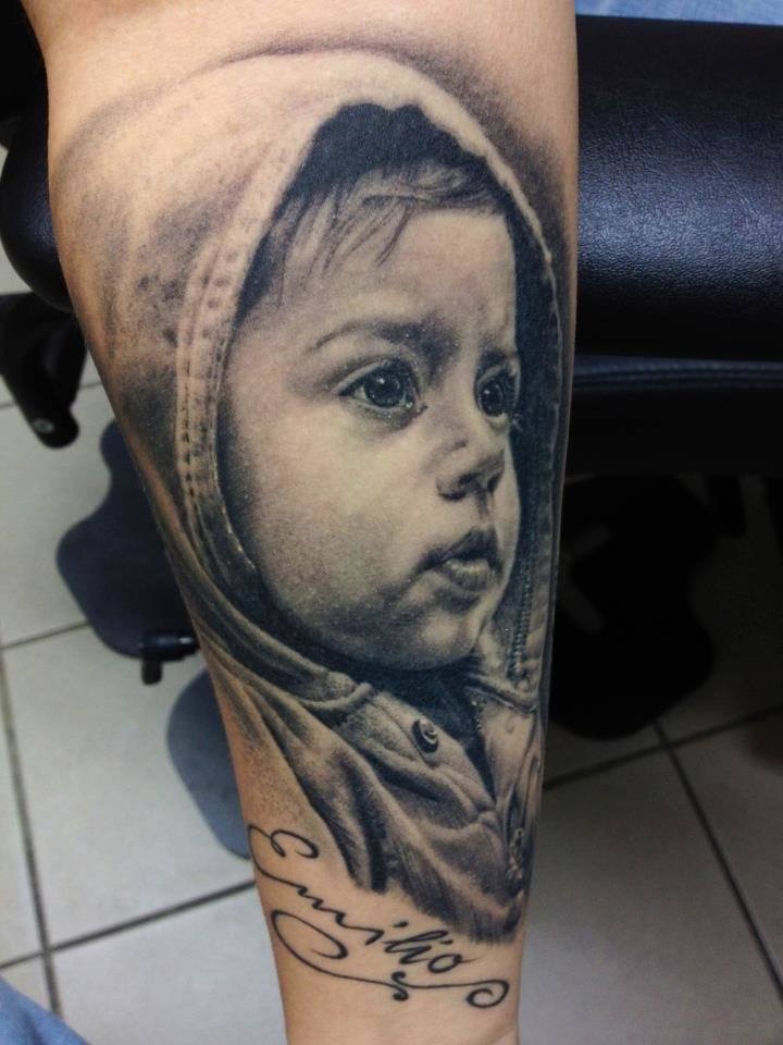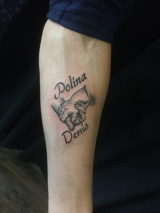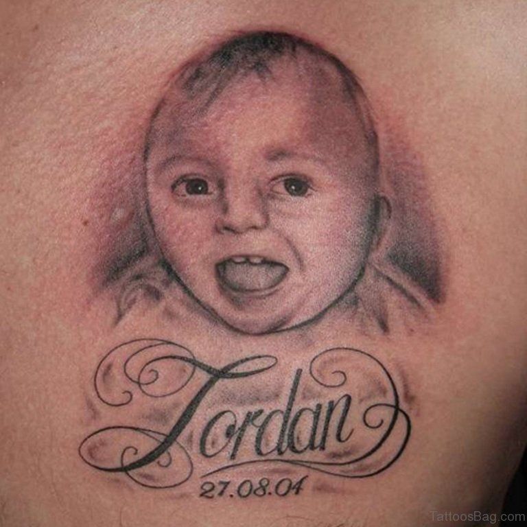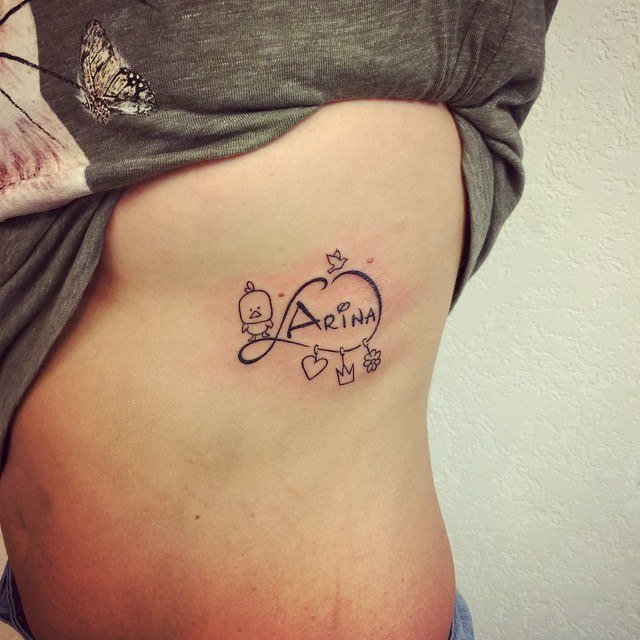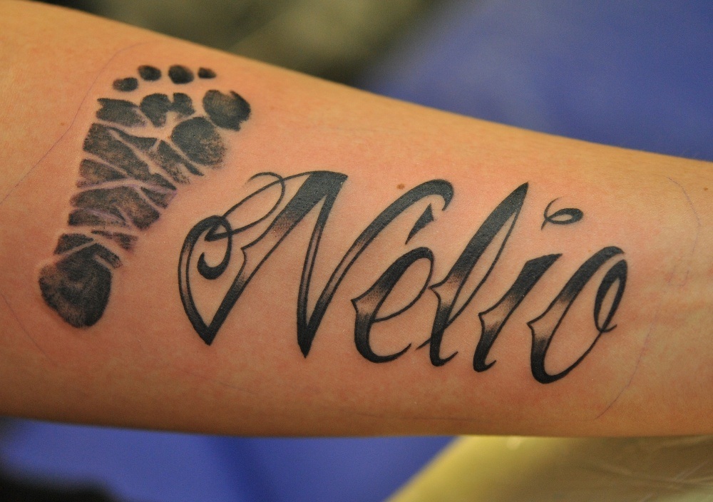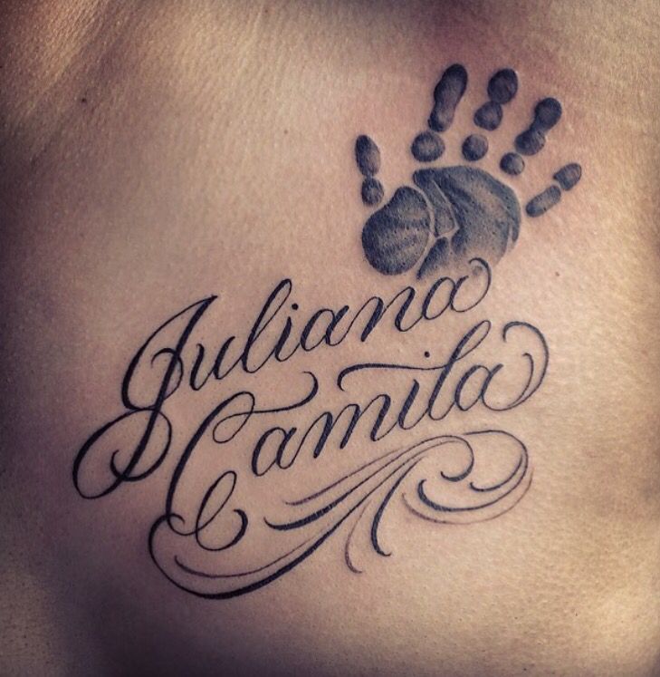La naissance d'un enfant est un événement très important et solennel pour les deux parents. Par conséquent, très souvent, des parents heureux décident de se faire tatouer avec le nom de leur propre enfant. Très souvent, les noms des enfants sont complétés par leurs propres initiales ou par la date de naissance du bébé. Il y a souvent un portrait du bébé, réalisé dans le style du réalisme. Il est à noter qu'avant de réaliser un tel dessin, il est nécessaire qu'un peu de temps s'est écoulé depuis la naissance de l'enfant pour que son apparence se forme au moins un peu. Une option inhabituelle sera une inscription avec le nom de l'enfant en combinaison avec l'empreinte d'une jambe ou de cubes en jeu. Certains préfèrent mettre les noms des enfants sur la poitrine en signe de relation proche.