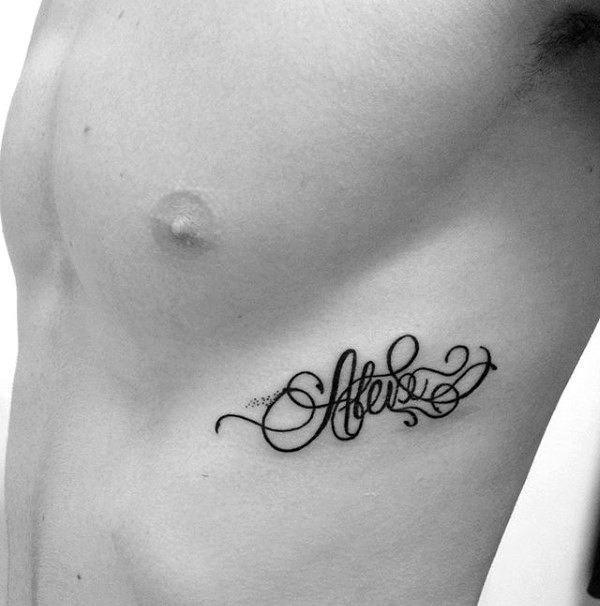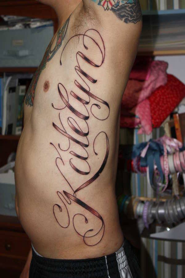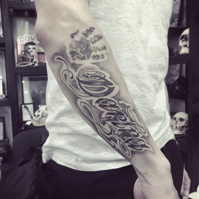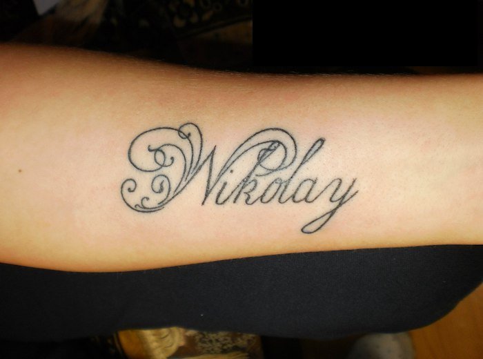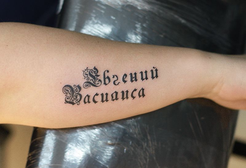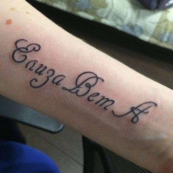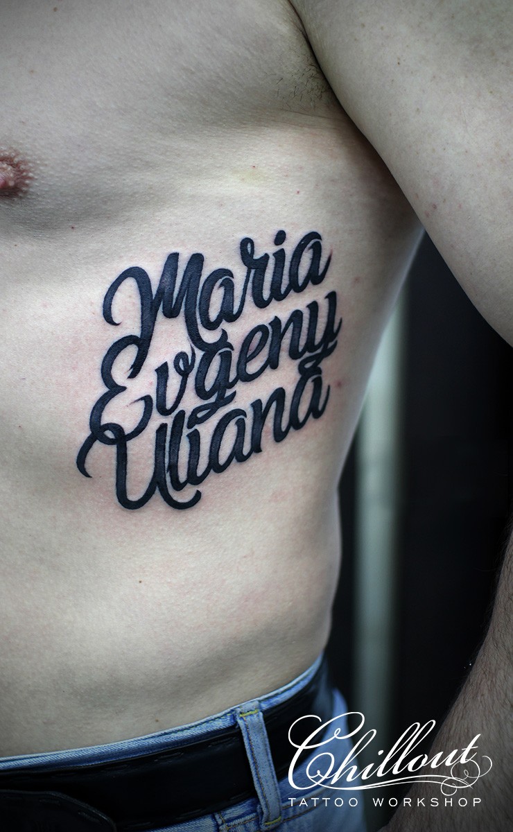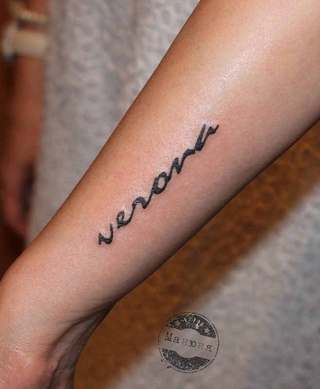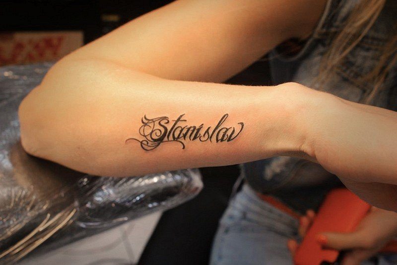 Les tatouages de ce type peuvent être appliqués séparément ou en tant que composant de la composition. Si les images à grande échelle ne vous conviennent pas, il est donc très important de choisir une bonne police pour que le tatouage ait l'air sophistiqué et intéressant. Il existe une grande abondance de polices, tout dépend donc de vos préférences personnelles. Pour les filles, un style d'écriture avec des lignes lisses, minces et arrondies est préférable. Cela mettra l'accent sur la tendresse, la fragilité et le charme du propriétaire. Les hommes sont caractérisés par une police rugueuse et massive. Très souvent, les noms sont traduits dans différentes langues, par exemple le latin, le chinois ou l'anglais. Donc, le tatouage aura l'air inhabituel et attrayant.