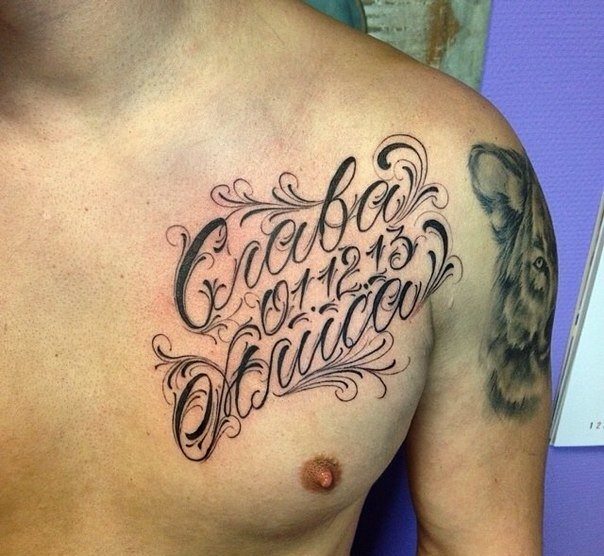 Le dessin pectoral est le meilleur moyen de montrer des sentiments sincères et des intentions sérieuses pour une personne. Seules les personnes réellement affectueuses peuvent décider de cette étape. Après avoir tapé le nom de la seconde moitié, vous pouvez capturer à jamais la mémoire d'un être cher. Mais avant que vous ne décidiez de cela, vous devez bien réfléchir car il arrive que les sentiments disparaissent et que le tatouage reste sur le corps pour toujours. Un tel motif peut être combiné à divers éléments, par exemple une rose - en signe d'amour épanoui et de sentiments forts, un signe d'infini - un symbole de dévotion éternelle, ou un cœur - un signe de relations sincères et durables.