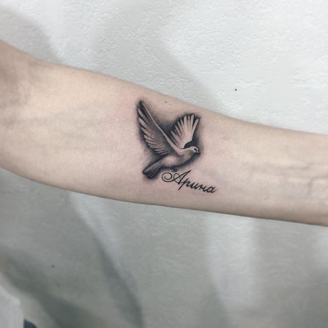 Les papillons sont l’un des éléments les plus aimés du beau sexe. Le plus souvent, un papillon qui flotte est placé sur l'une des lettres du nom. Ainsi, le tatouage prend un aspect doux, envoûtant et attrayant.