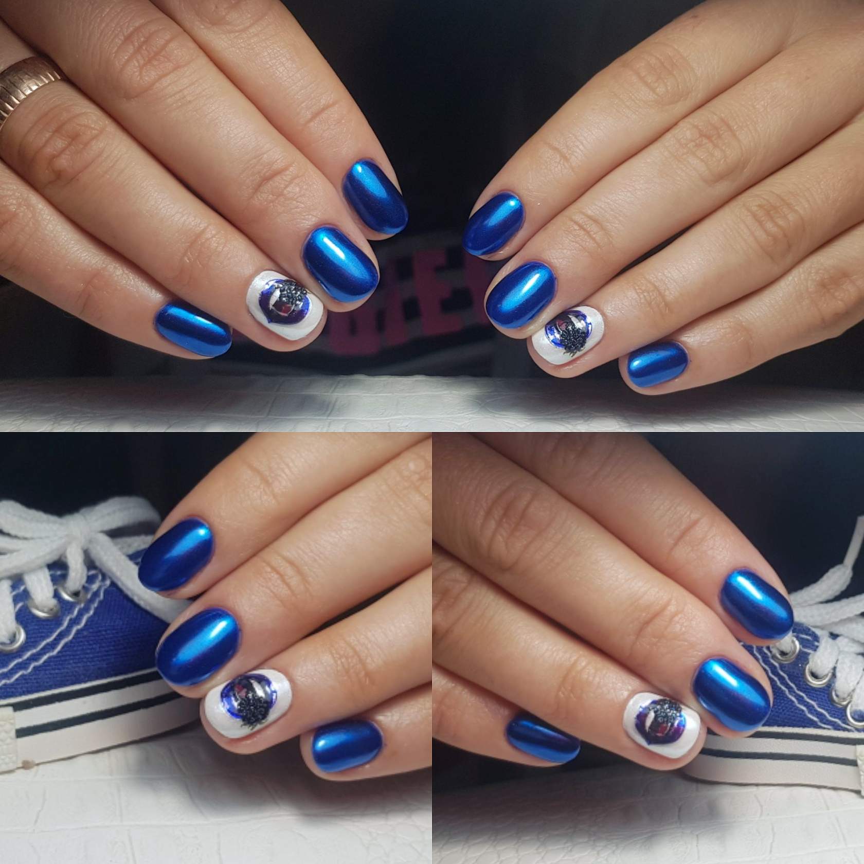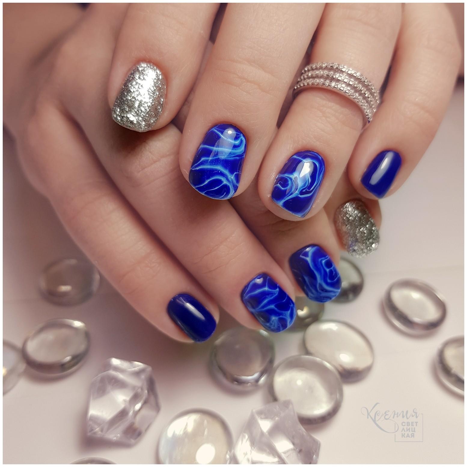 - Couleur bleu profond en manucure.