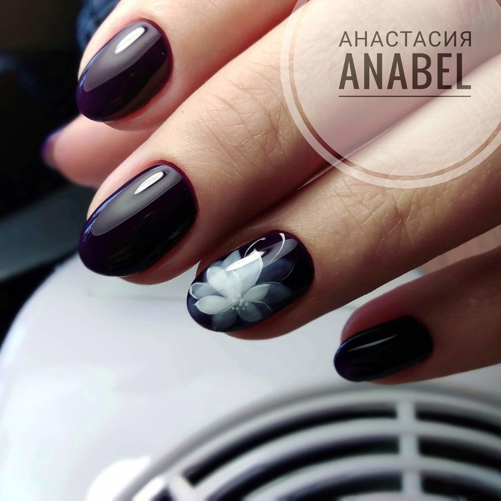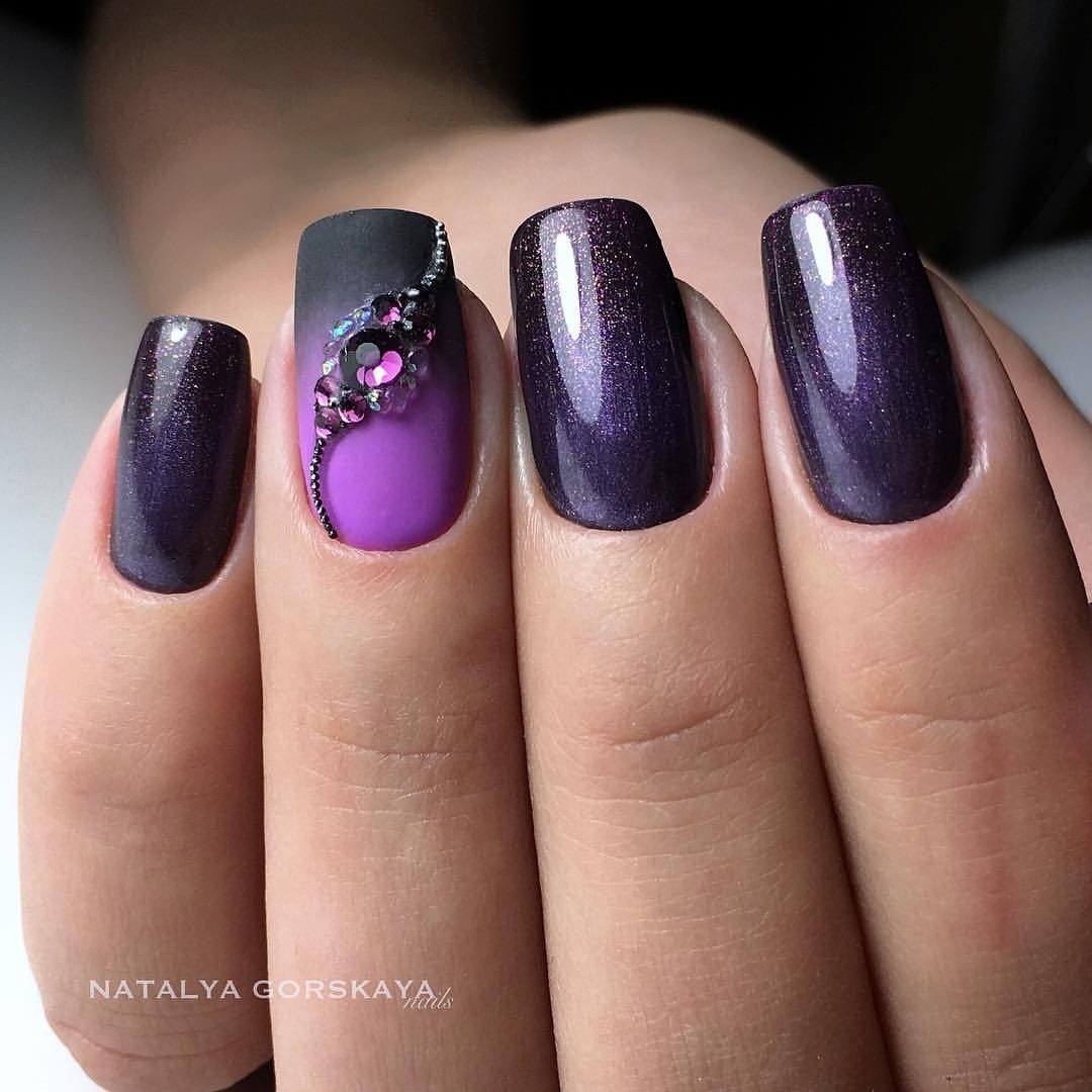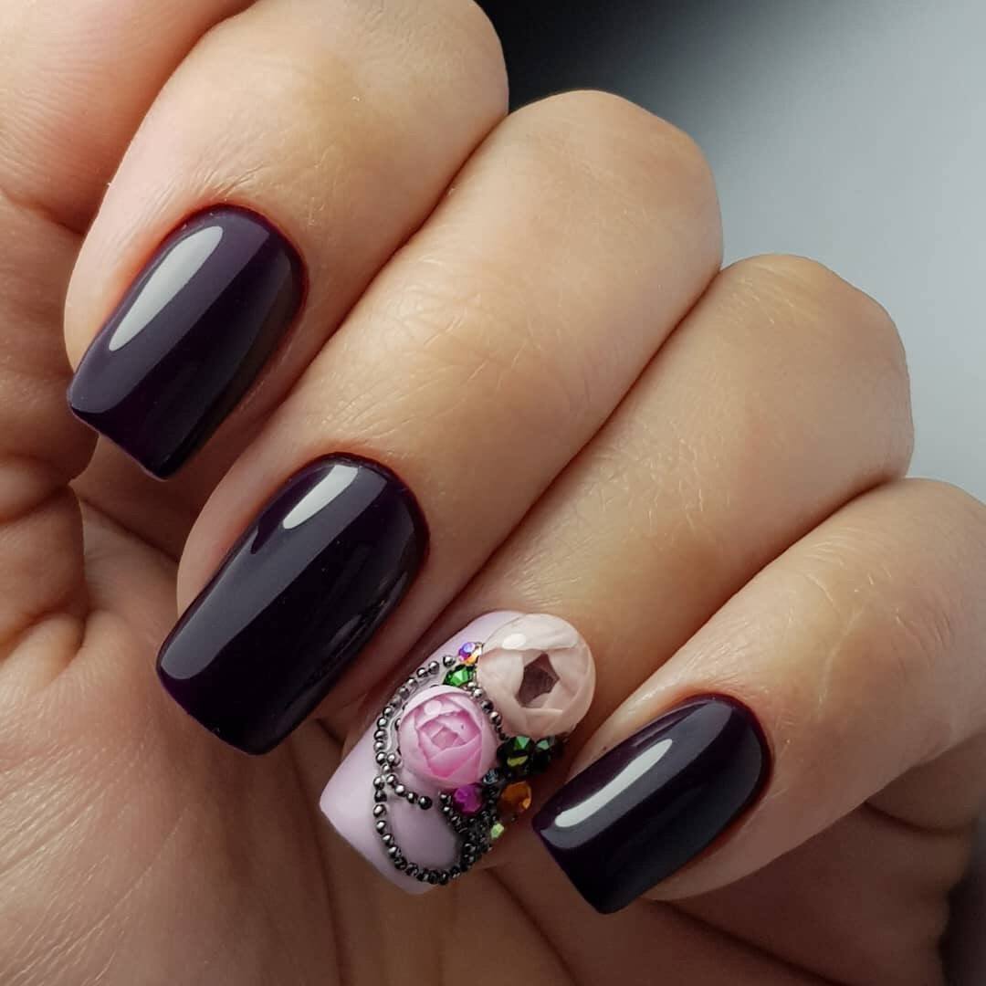 Tout revêtement sombre, qu'il soit noir, bleu, bordeaux ou de toute autre teinte, a l’air très riche, avec un dessus mat et de petites étincelles ou strass. Charme sera un dessin sombre dans un dégradé utilisant des paillettes, avec une bande de kamifubuki, ou une impression sous forme de peinture des ongles.