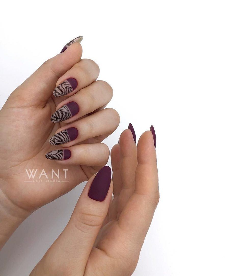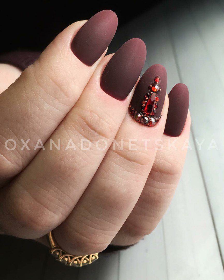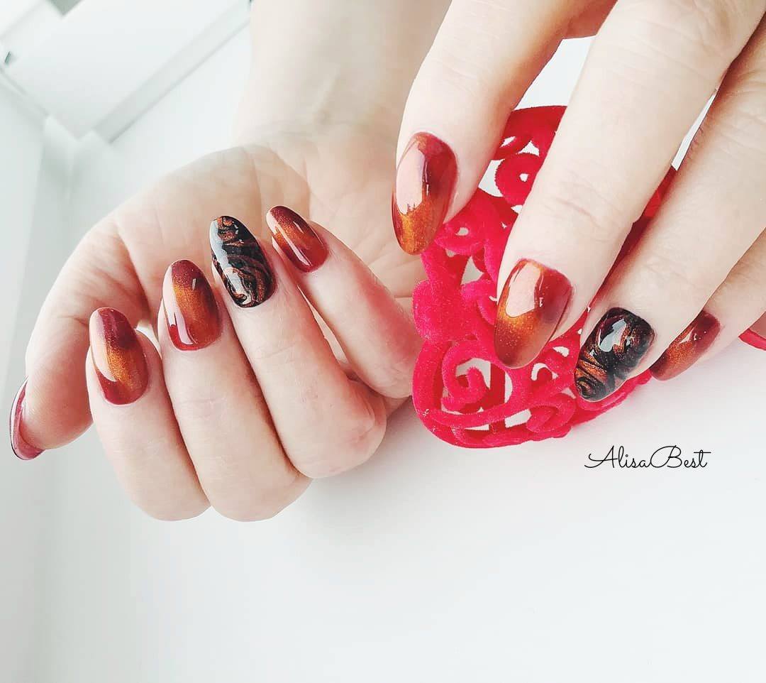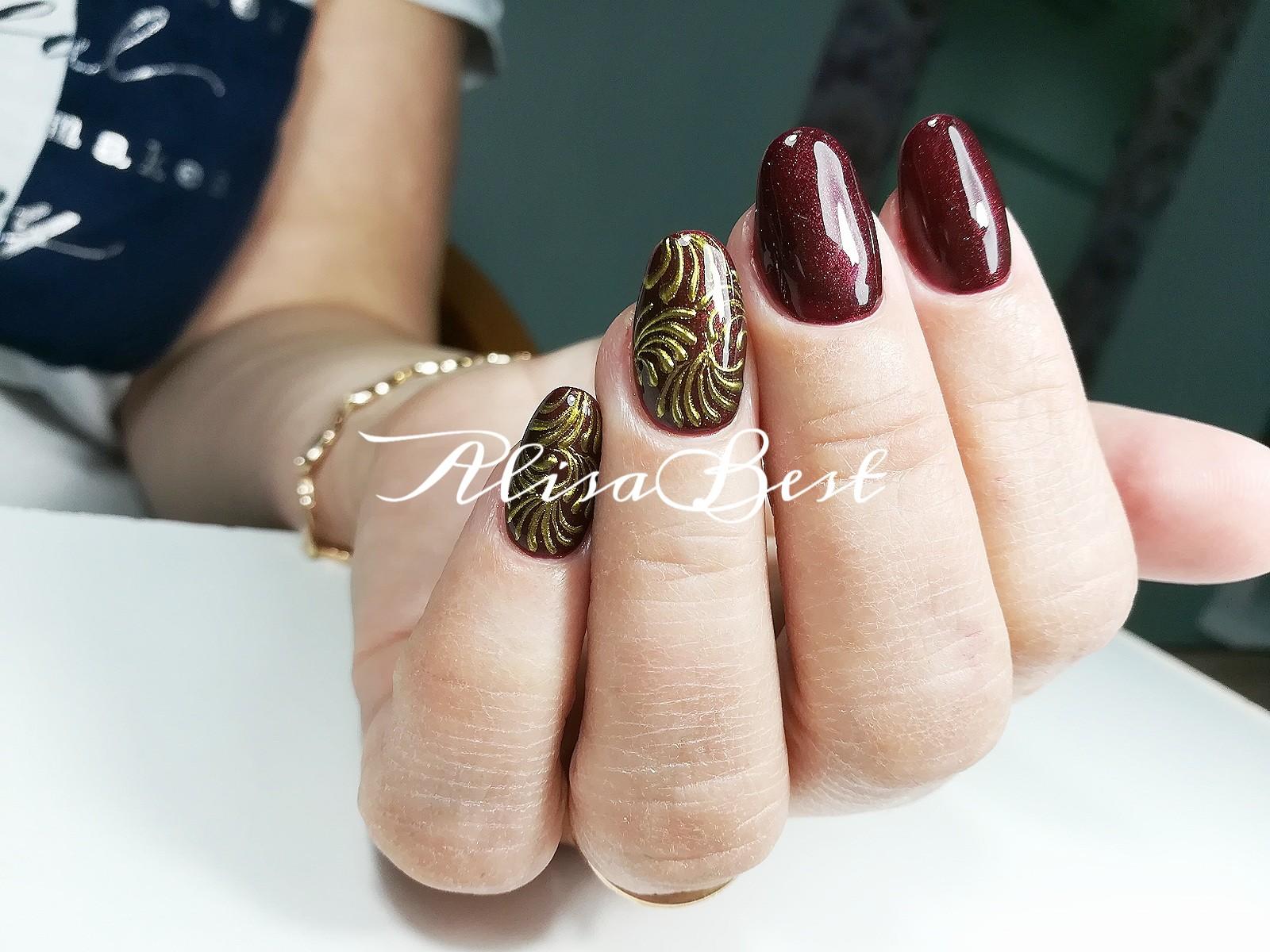 Cette saison, toutes les nuances de Bourgogne sont en demande. C'est un classique qui ne se démode jamais et qui convient à tout type de femme. Masters a proposé un grand nombre de techniques correspondant à cette palette de couleurs et révélant pleinement son potentiel. La couleur rouge, qui est prise comme base dans un duo avec du brun, est ravissante, à la fois sur les longues plaques à ongles pointues et sur une courte longueur. Il se marie parfaitement avec les notes dorées du design, il ressemble à un roi avec des pierres et est poudré.
