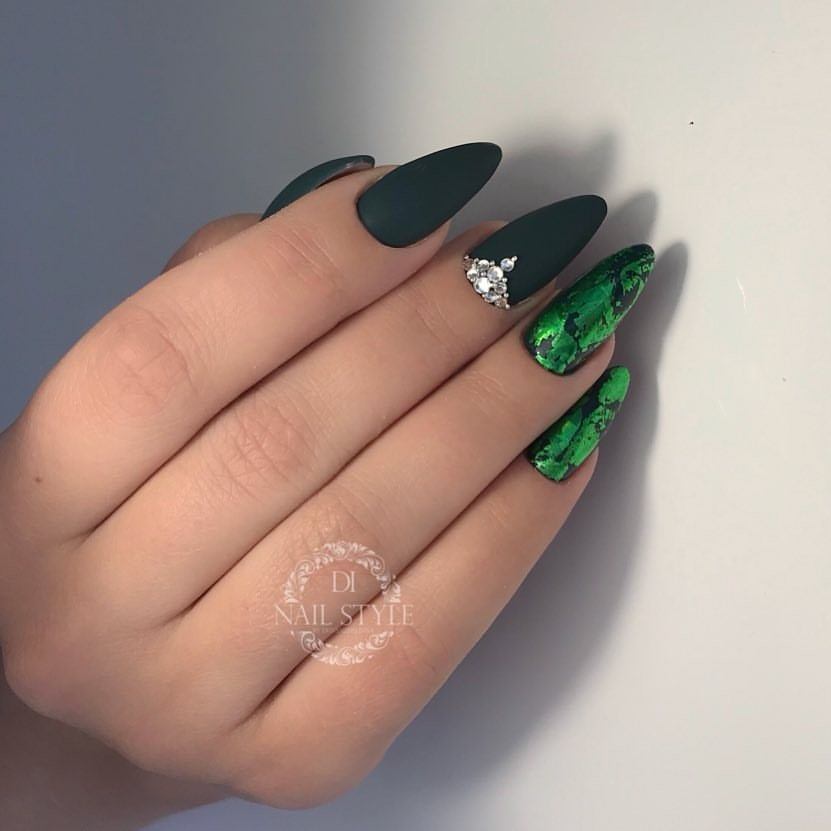 La manucure verte a acquis une grande popularité en raison de sa variété de nuances. Cela vous permet de combiner facilement différents contrastes de tons, de combiner plusieurs nuances en même temps et de combiner cette couleur avec d'autres palettes. La manucure verte de cette saison de la mode peut être combinée avec des paillettes, du papier d'aluminium et d'autres éléments décoratifs.