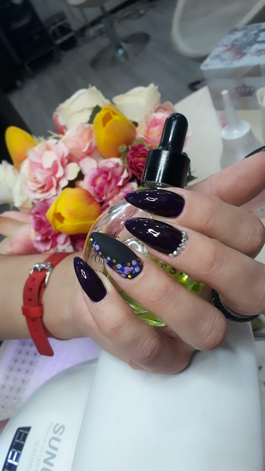 Une ravissante couleur pourpre vous conquérera par sa profondeur et ses notes magiques. Une application en dégradé avec d’autres nuances, un éclat de paillettes exquis, un brillant brillant et des revêtements de velours à décor doré vous captiveront à jamais et attireront l’attention sur votre manucure.