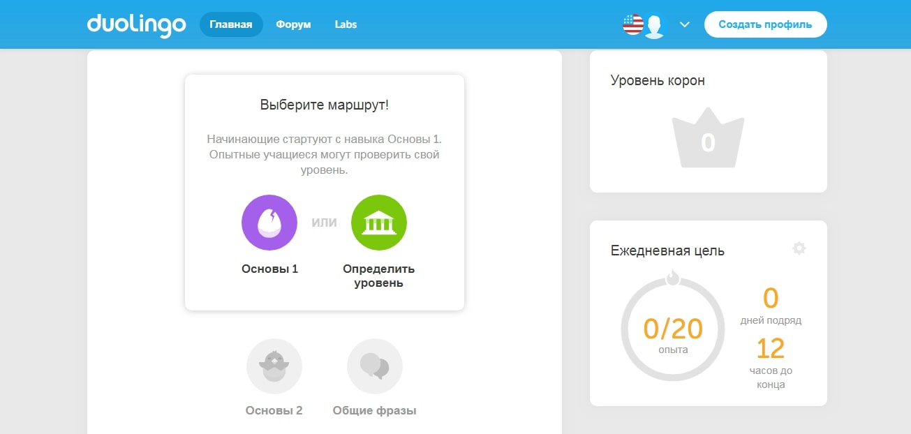 Un autre site assez populaire en russe pour apprendre l'anglais est idéal pour les débutants. Une belle interface, ainsi que le personnage principal sous la forme d'un hibou mignon, plairont sûrement à tout le monde. Il est à noter que le programme lui-même est construit sous la forme d'un "arbre de réalisations". Cela signifie que vous ne pouvez accéder à un nouveau niveau qu'en marquant un certain nombre de points.