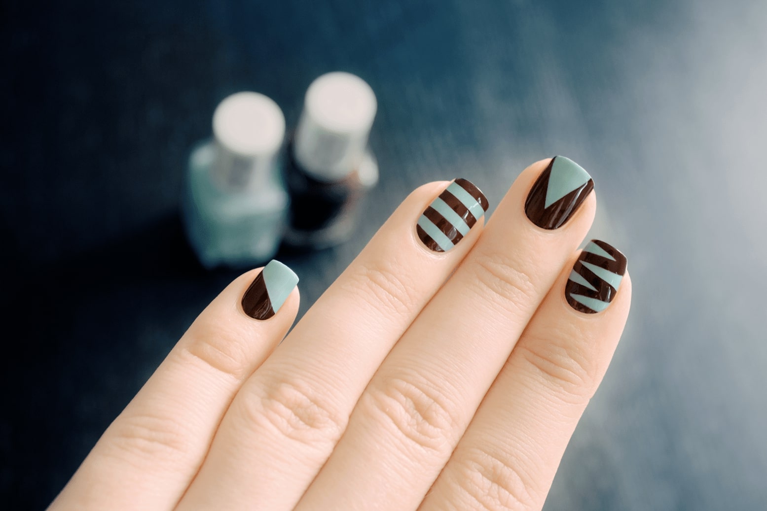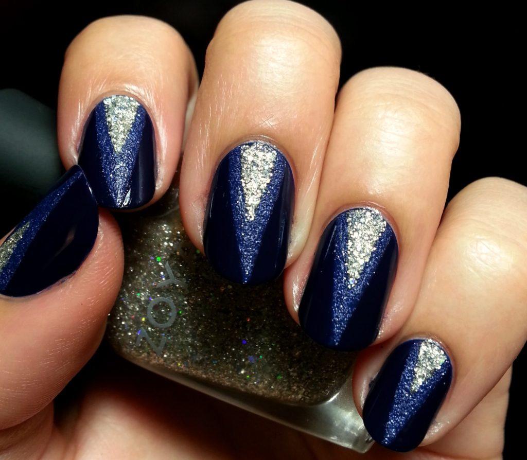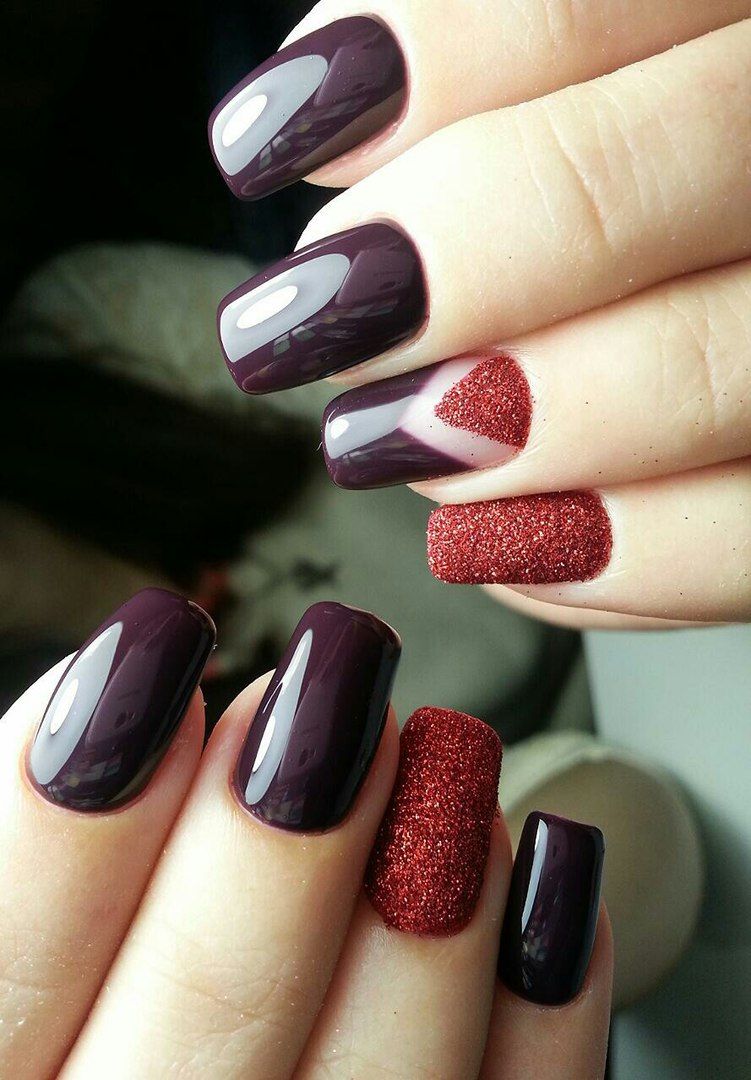 Des teintes sombres de vernis sont au moins utilisées dans la conception des ongles. Il s’agit principalement de brun, chocolat, gris, bleu, émeraude et noir. Chacune d'elles a fière allure non seulement en tant que revêtement principal, mais également en mettant l'accent sur une manucure triangulaire. L'option la plus appropriée serait une soirée, un événement ou une fête.