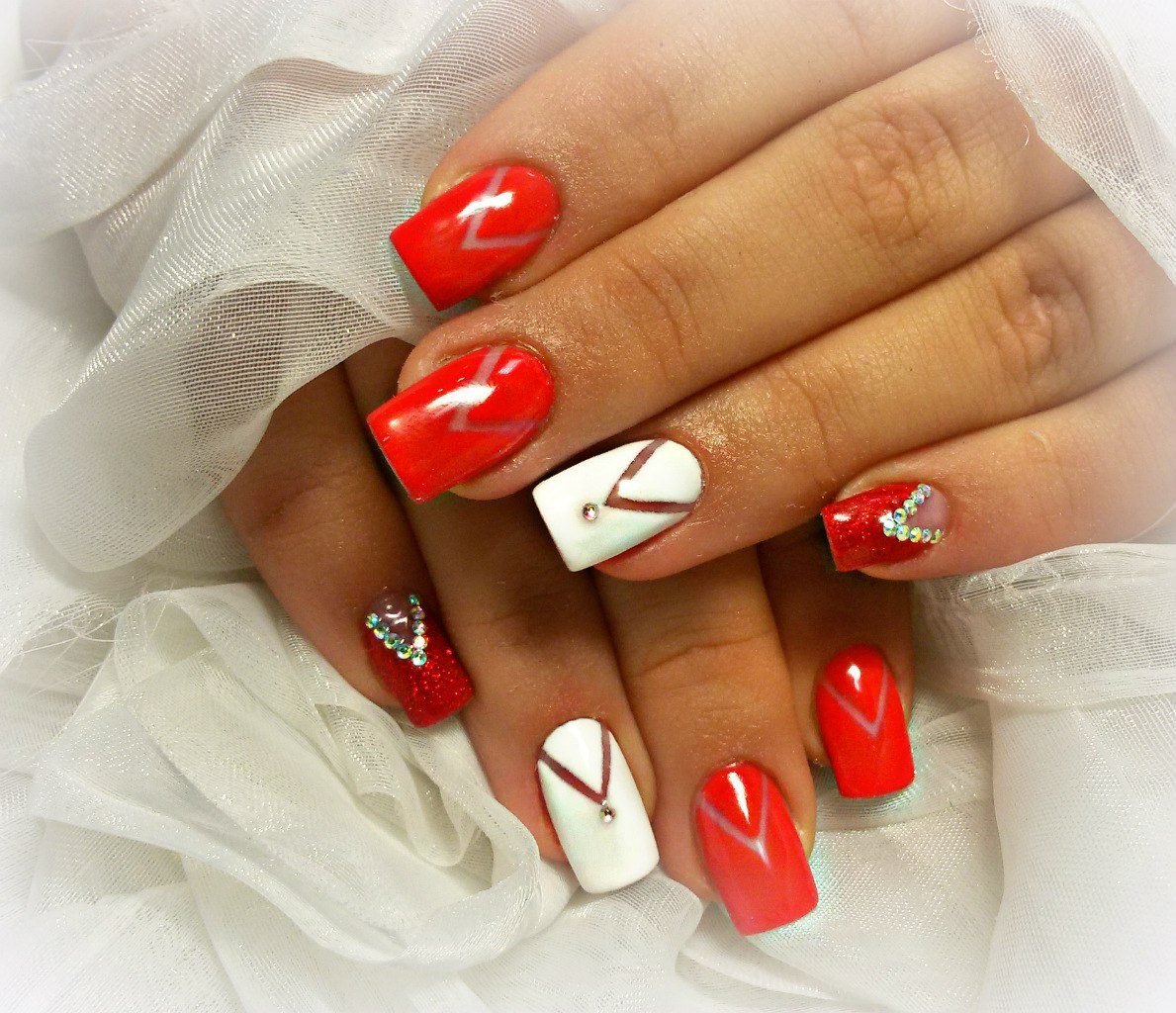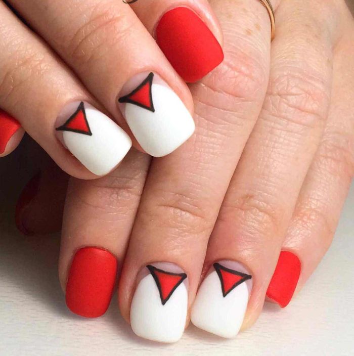 Les trous triangulaires sont souvent recouverts d'une nuance de vernis contrastante. Grâce à cette approche, le design est plus vif, visible et accrocheur. Cela est particulièrement vrai pour la saison estivale, quand tout le monde veut absolument expérimenter et essayer quelque chose de nouveau. La combinaison la plus pertinente est la manucure en noir et blanc, en noir et rouge ou en rouge et blanc. Ces nuances ont l'air parfait dans un design. Par conséquent, si vous préférez un classique sobre, il est préférable de regarder cette décision.