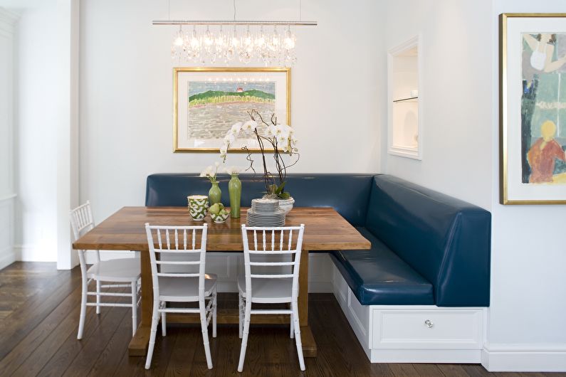 Les petites et moyennes cuisines conviennent à un petit canapé de cuisine. Dans ce cas, une zone indépendante est formée avec la table de la cuisine. Ce sera une exception à la règle - "tous les meubles de cuisine dans un style." Parfois, vous pouvez vous permettre une certaine liberté. Il est conseillé que le canapé soit légèrement plus sombre que la table.