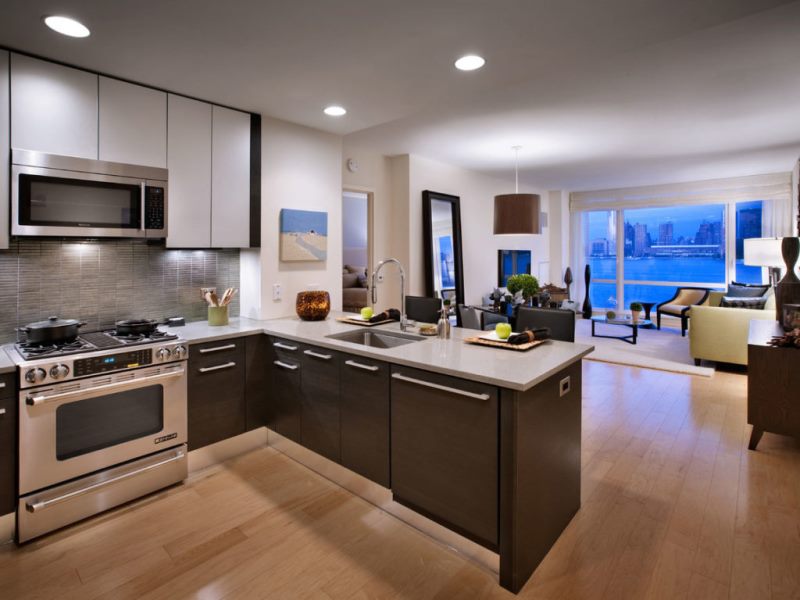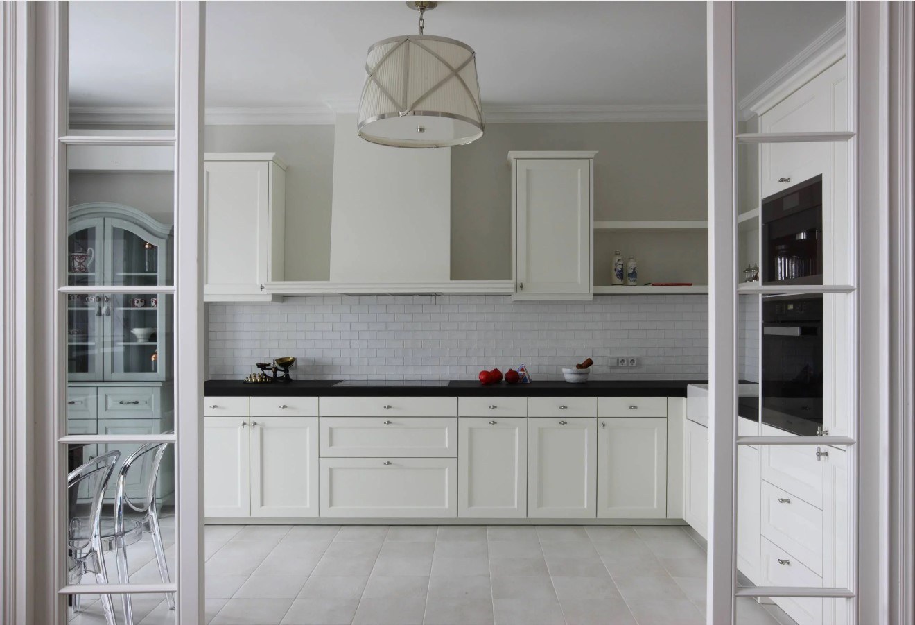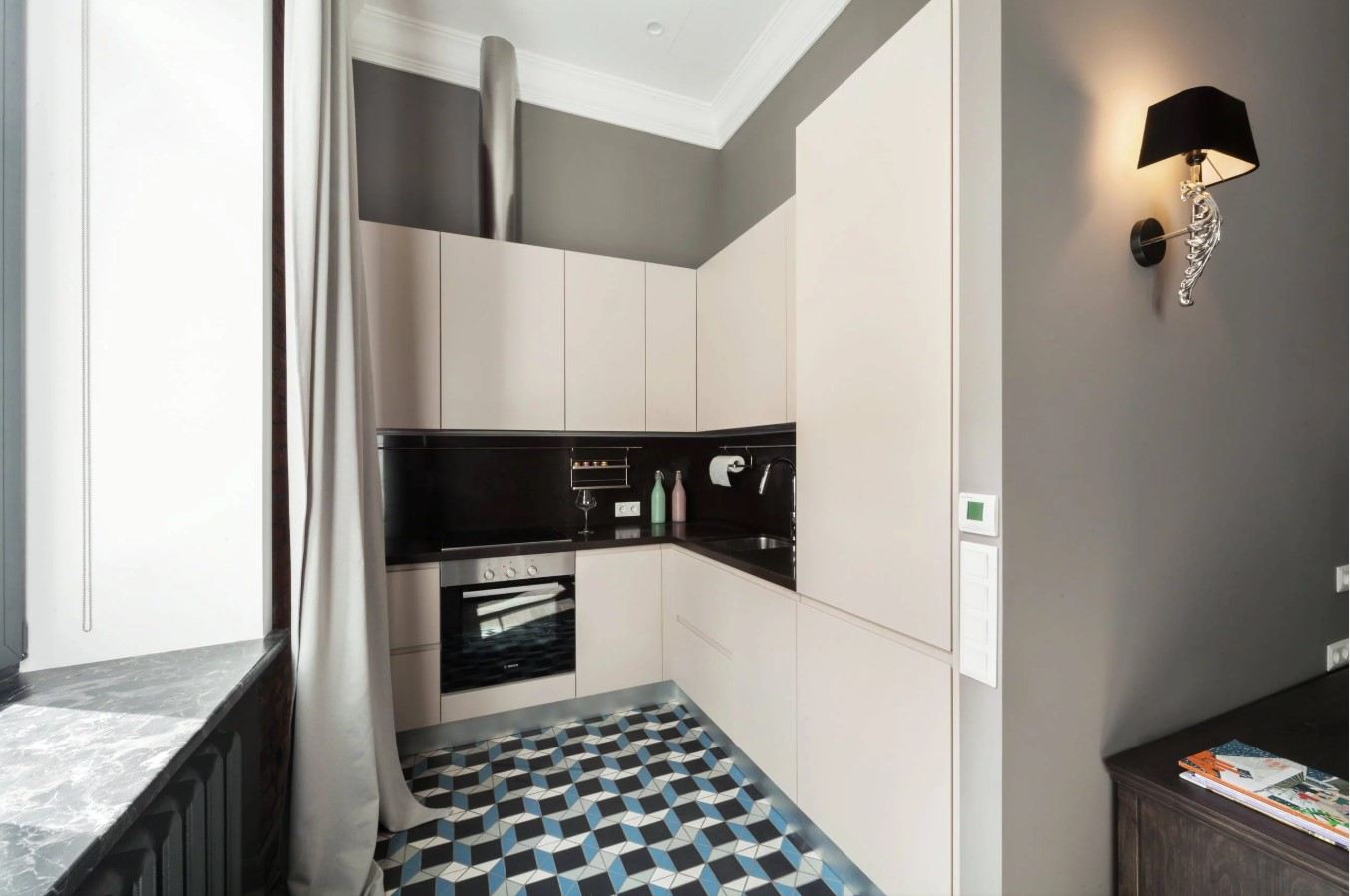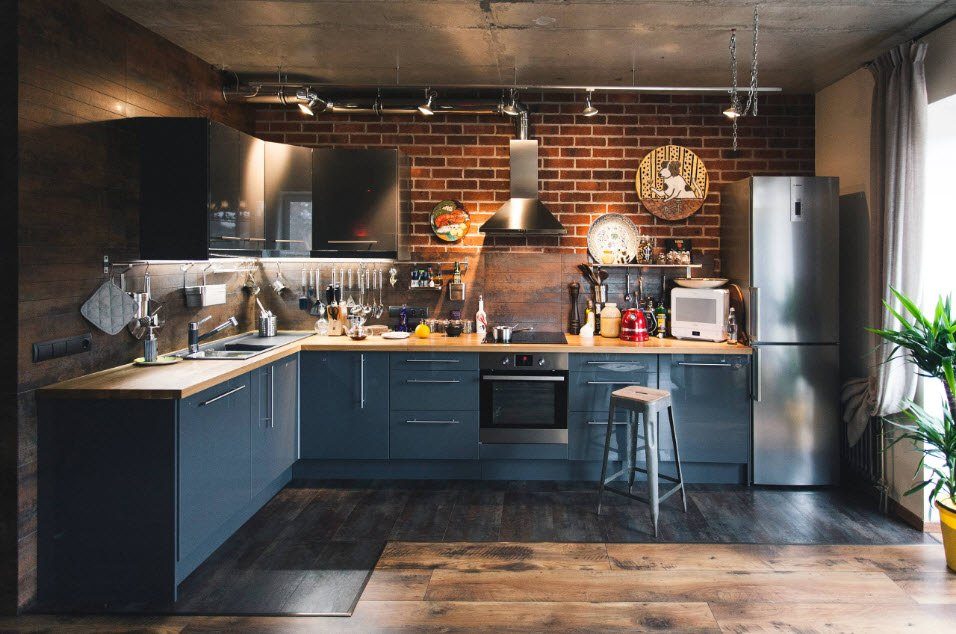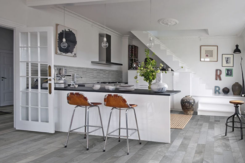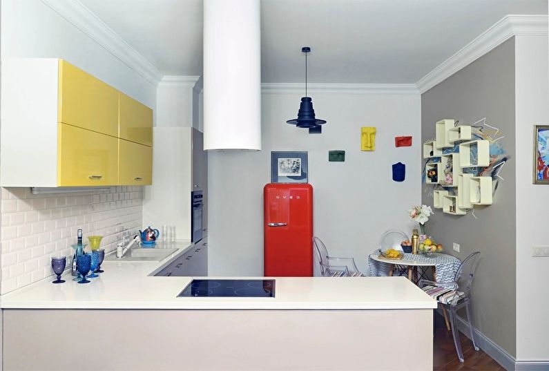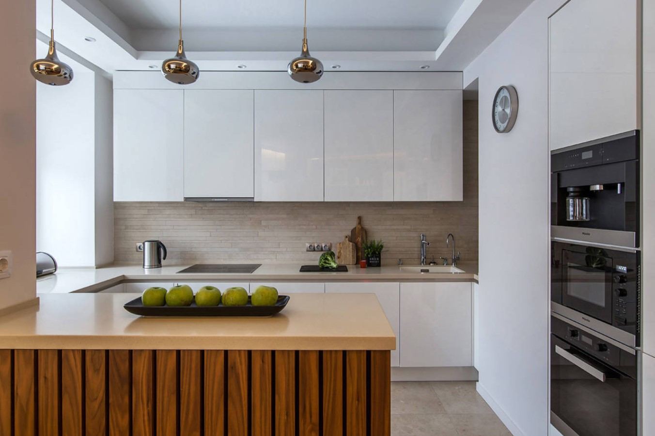 Les cuisines de ce type sont généralement en forme de U, c.-à-d. deux murs adjacents sont réservés à la cuisine et le comptoir de bar forme ou occupe le troisième. Cette solution est bien appliquée pour les studios, où vivent une ou deux personnes. L'utilisation d'un comptoir de bar comme table à manger peut considérablement économiser de l'espace dans l'appartement.