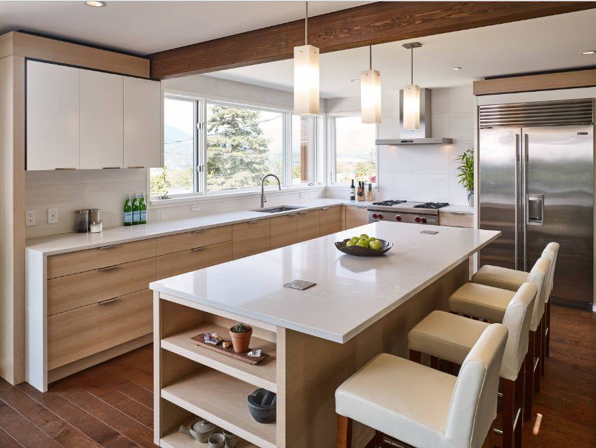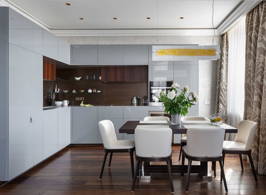 Le centre d'attention et de décoration de toute la maison peut être une cuisine combinée avec un salon. Il s'avère une pièce très spacieuse. Les meubles faits d'essences précieuses d'arbres ont fière allure dans de telles cuisines. Ici vous pouvez mettre une grande table à manger, à laquelle une grande entreprise se rassemblera. Et l’hôtesse pourra facilement cuisiner dans une telle cuisine, du fait de la proximité des surfaces de la cuisine.