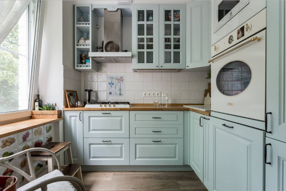 Dans une rangée, il est impossible d'installer tout le mobilier nécessaire sur 5 mètres carrés. la cuisine Avec la petite taille de la cuisine d'angle, vous devez choisir des comptoirs étroits. Le rebord de la fenêtre devrait être transformé en une continuation des comptoirs. Du lave-vaisselle, bien sûr, avec une telle taille de la cuisine, vous devez refuser. Elle prend trop de place.