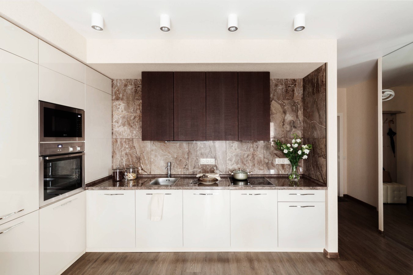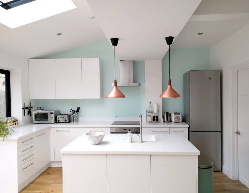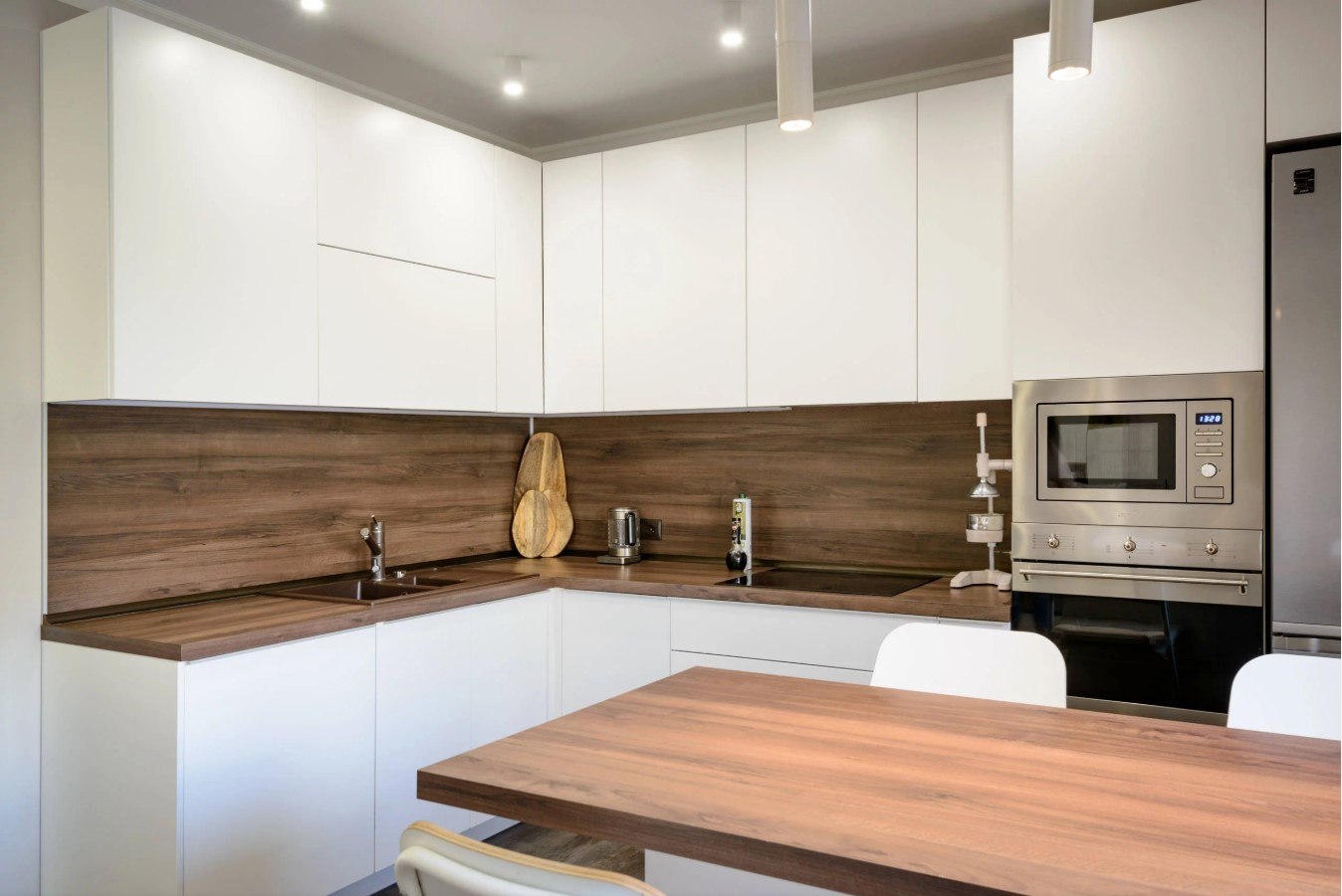 Si la partie supérieure de la cuisine a deux tons, la partie inférieure devrait être un ou deux tons plus foncés. Si vous jouez avec les contrastes entre le mur et le mobilier, vous vous en tirerez très bien. La pâleur des murs peut être compensée par un casque lumineux et inversement.