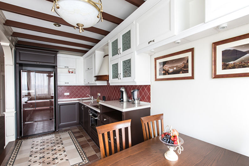 Un plafond blanc standard convient à toutes les cuisines. Cette couleur ne gâchera jamais l'idée. Il peut être peint un peu de peinture teintée dans la couleur générale de la cuisine. Pas besoin de s'impliquer. Ils sont dus au fait que la lumière réfléchie par un plafond sombre peut s’aggraver dans la cuisine.