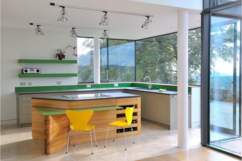 Les cuisines vertes attirent l'attention, elles sont très lumineuses. Cette couleur est parfaite pour les cuisines combinées. Les variations vertes semblent également bonnes - kaki, marais, citron vert, citron vert, malachite, turquoise.