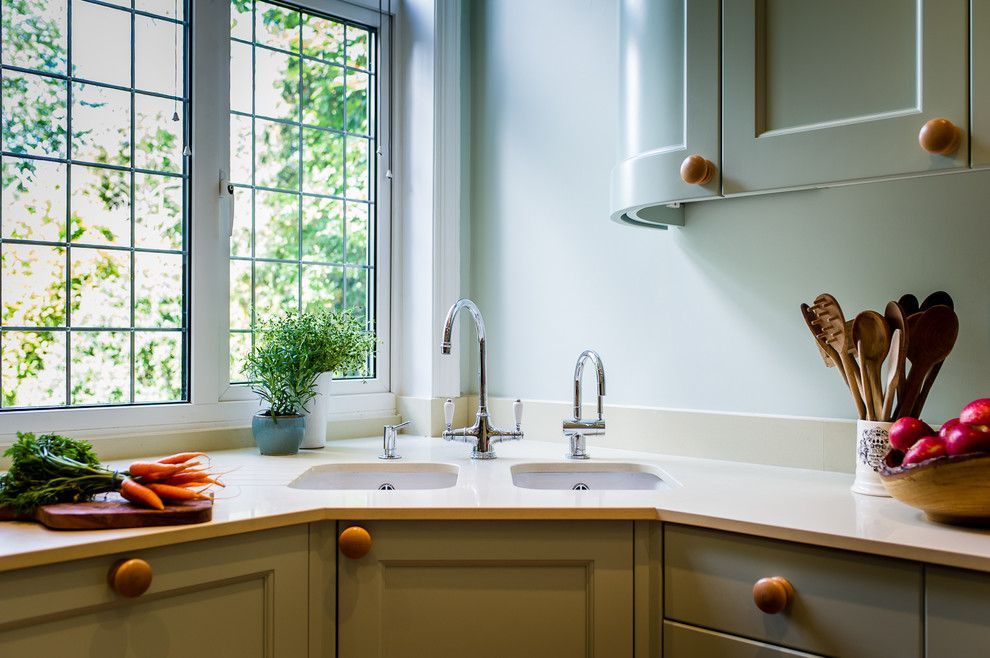 L'évier dans les cuisines d'angle doit être placé dans le coin situé entre les deux murs. De plus, les éviers d’angle sont presque toujours plus grands que d’habitude, ce qui convient aux grandes familles. Actuellement, le choix de tels éviers est très vaste.