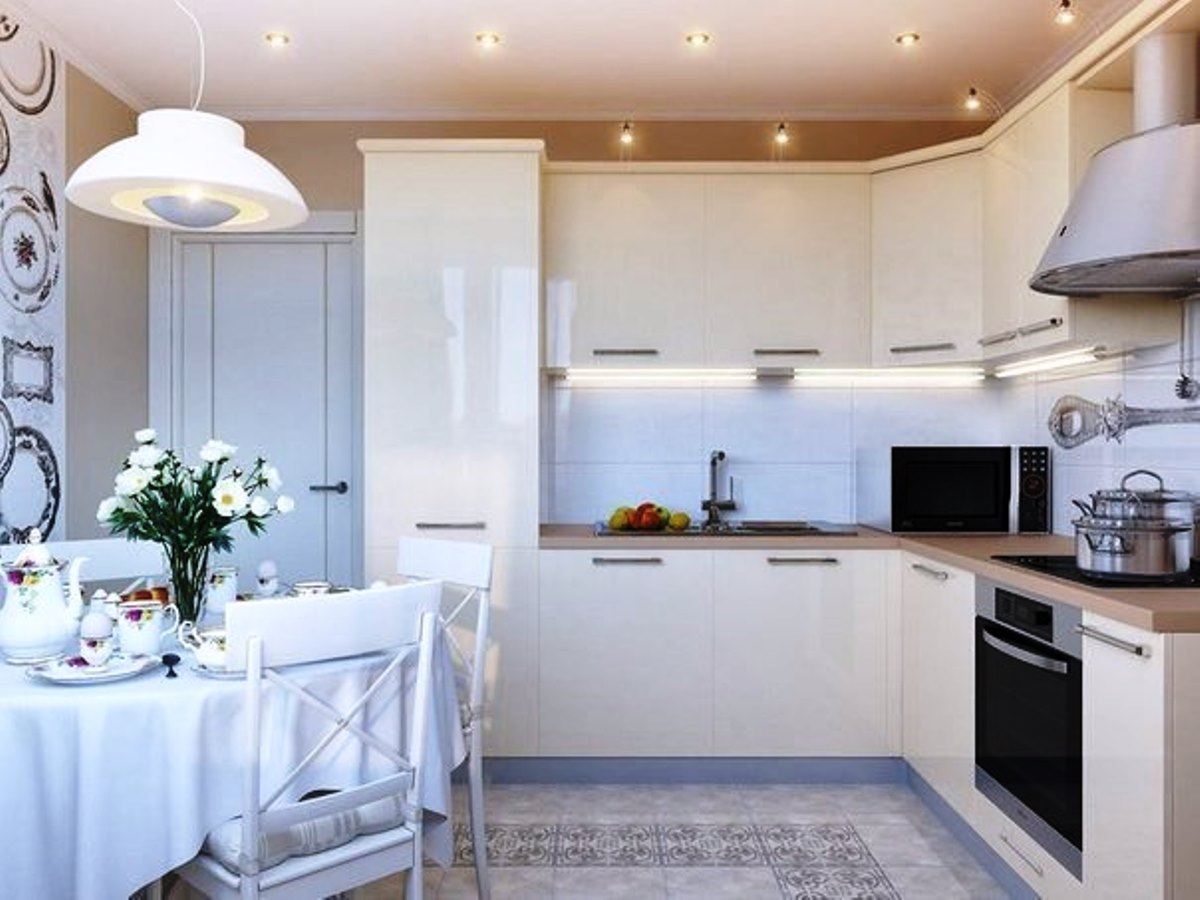 Pour économiser de l'espace et augmenter visuellement le coin cuisine, vous pouvez abandonner complètement le lustre au plafond. Au lieu de cela, il est permis de coller une bande de LED au bas des armoires, ainsi que d'installer des lampes intégrées. Cela permettra de zoner l'éclairage et peut-être qu'il y aura encore plus de lumière.
