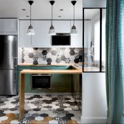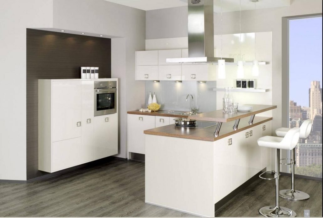 Les cuisines de ce type sont généralement en forme de U, c.-à-d. deux murs adjacents sont réservés à la cuisine et le comptoir de bar forme ou occupe le troisième. Cette solution est bien appliquée pour les studios, où vivent une ou deux personnes. L'utilisation d'un comptoir de bar comme table à manger peut considérablement économiser de l'espace dans l'appartement.