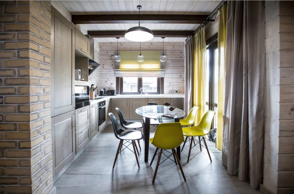 Le centre d'attention et de décoration de toute la maison peut être une cuisine combinée avec un salon. Il s'avère une pièce très spacieuse. Les meubles faits d'essences précieuses d'arbres ont fière allure dans de telles cuisines. Ici vous pouvez mettre une grande table à manger, à laquelle une grande entreprise se rassemblera. Et l’hôtesse pourra facilement cuisiner dans une telle cuisine, du fait de la proximité des surfaces de la cuisine.