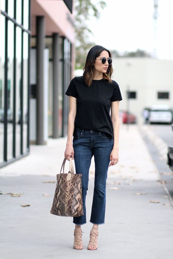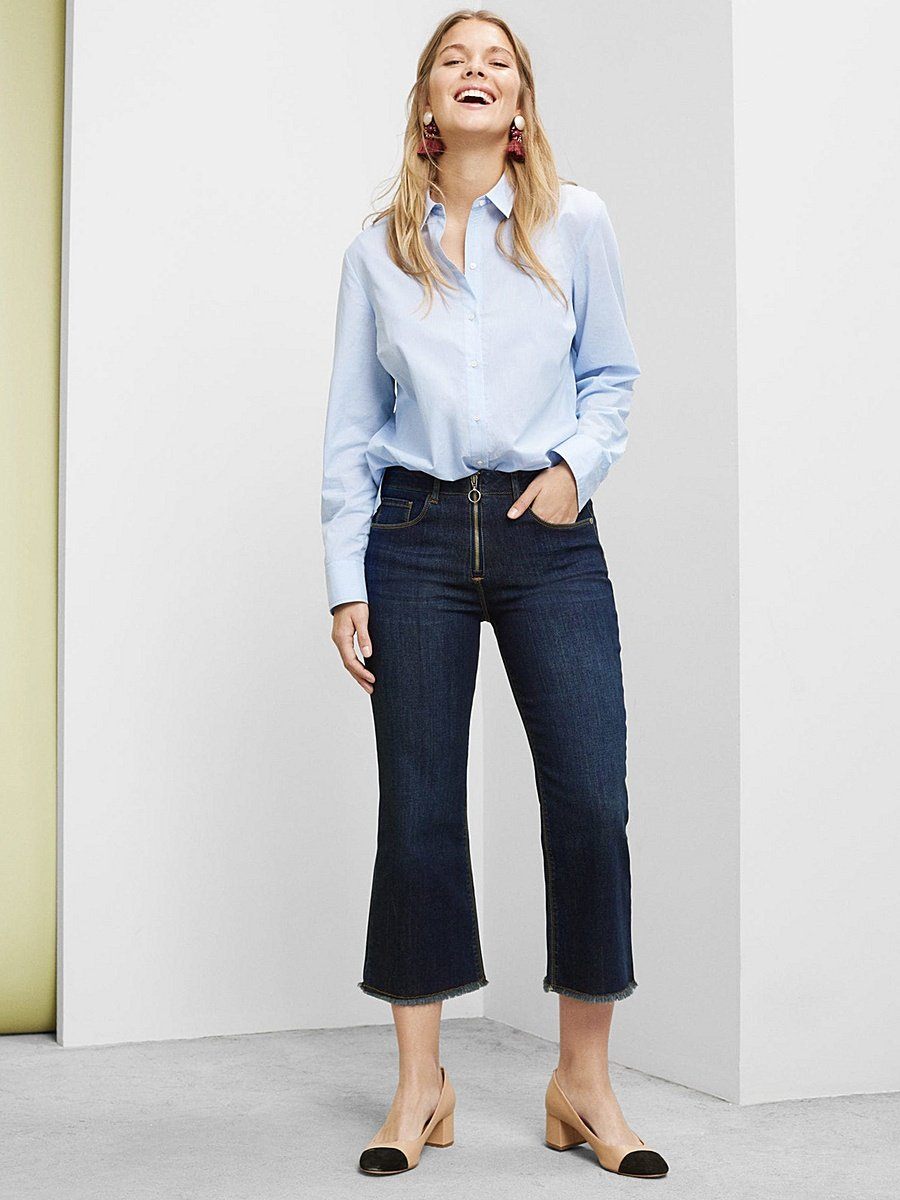 Lorsque vous choisissez un jean évasé raccourci, suivez la règle de base: le produit doit avoir une taille haute. C'est ce qui orne la figure féminine. Mais la nuance des jeans évasés raccourcis est laissée à votre discrétion.