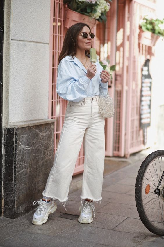 Bien que le blanc ne soit pas pratique, les femmes modernes de la mode aiment porter des jeans blancs. Les modèles légers raccourcis ont fière allure sur les modèles élancés. Le jean blanc court est exactement le même que le denim bleu habituel.