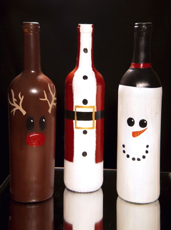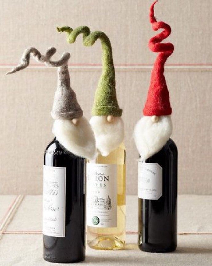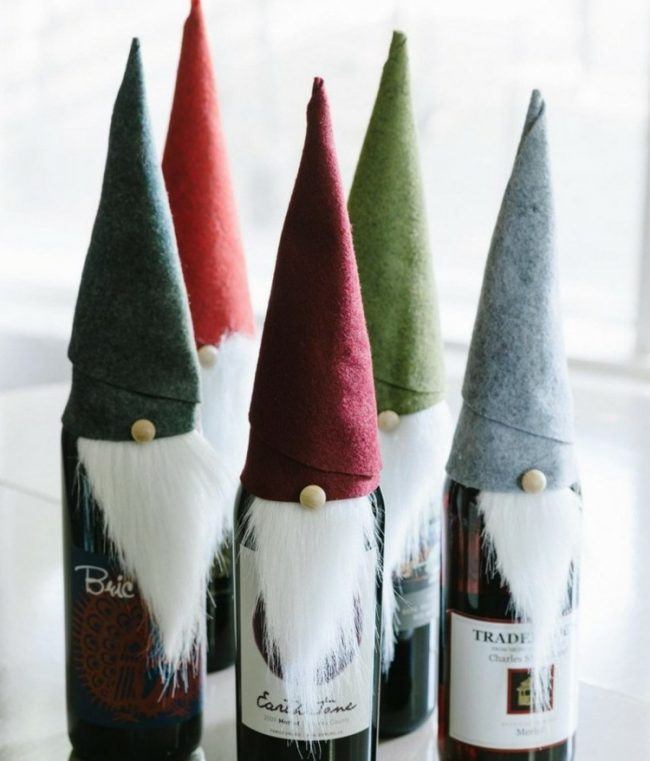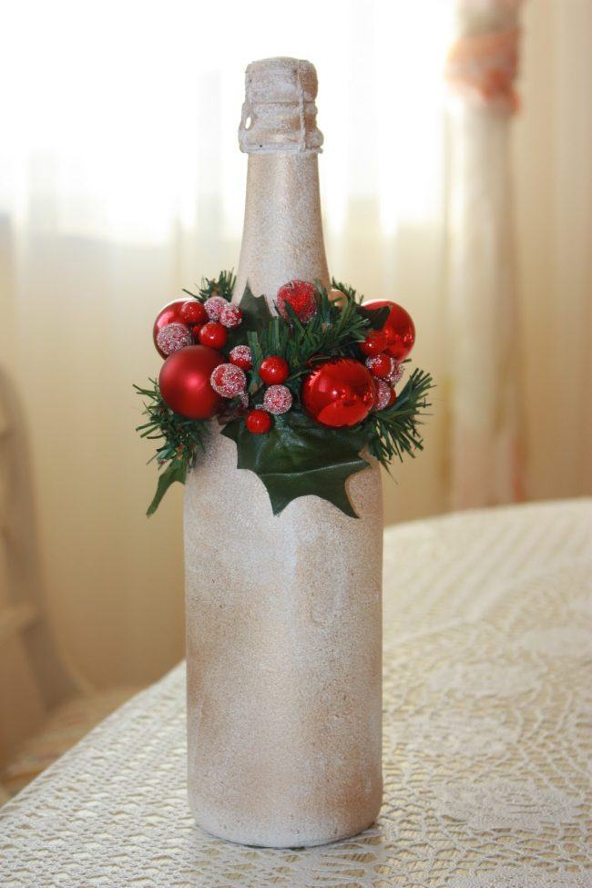 Si vous pensez qu’une bouteille habillée n’est pas une option très pratique, puisqu’il n’est pas très pratique de verser une boisson à faible teneur en alcool, décorez ensuite certaines parties, par exemple une étiquette ou un goulot. Découvrez de superbes compositions lumineuses du Nouvel An sous la forme d'une guirlande de Noël décorative posée sur une bouteille. Et si vous emballez également la bouteille dans du papier d'aluminium, après avoir bu de l'alcool, vous pouvez laisser une bouteille vide comme décoration du Nouvel An.
