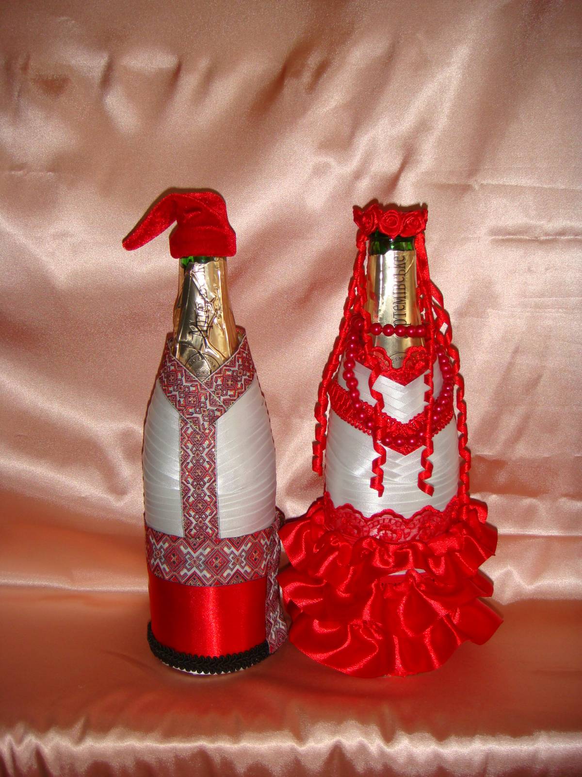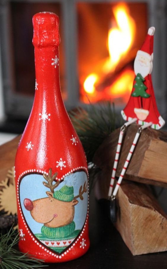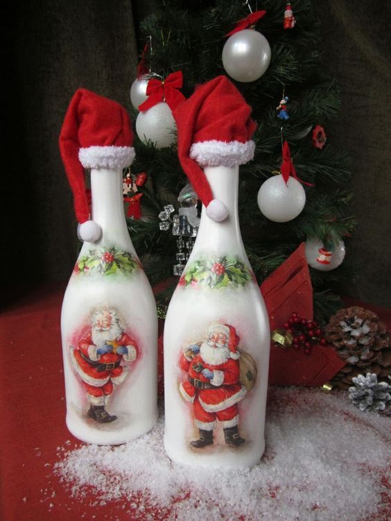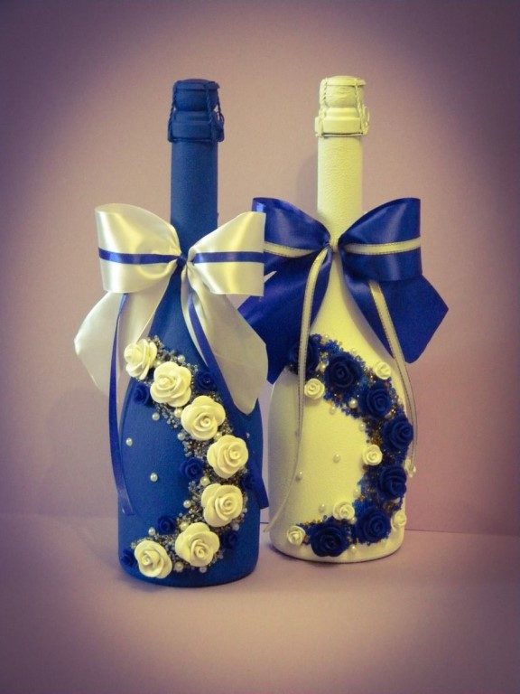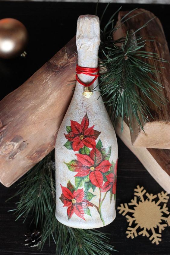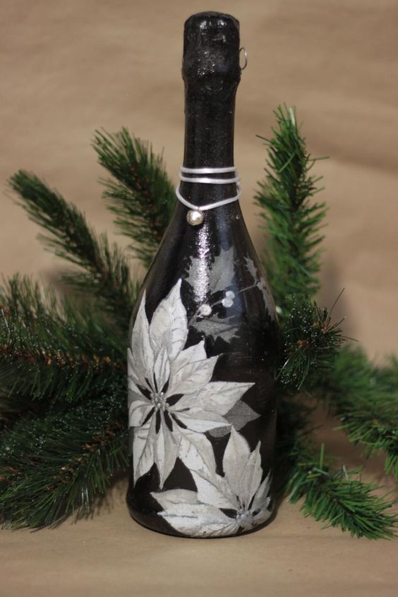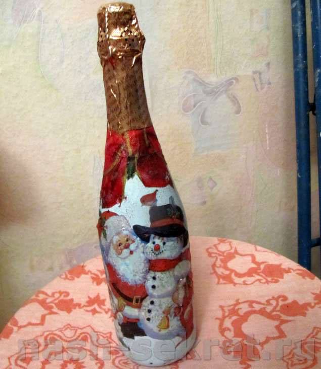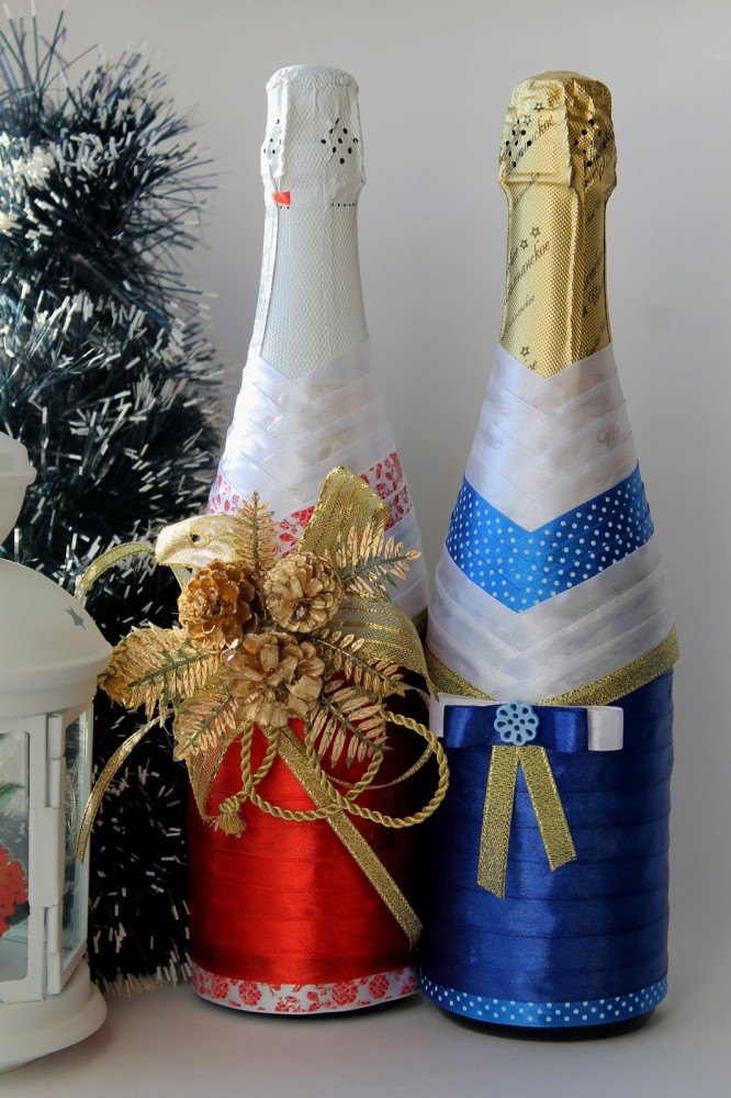 Il est intéressant de décorer une bouteille de champagne avec le pouvoir de chaque femme. Le processus prend un peu de temps, mais quel plaisir! Tous les efforts seront appréciés! Veillez à utiliser les symboles, les couleurs et les éléments du Nouvel An associés aux vacances pour la décoration du Nouvel An. Rubans de satin et de soie aux couleurs thématiques: rouge, vert, blanc, argent et or sont nobles et élégants sur une bouteille avec une boisson au champagne.