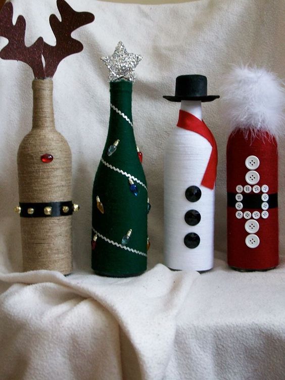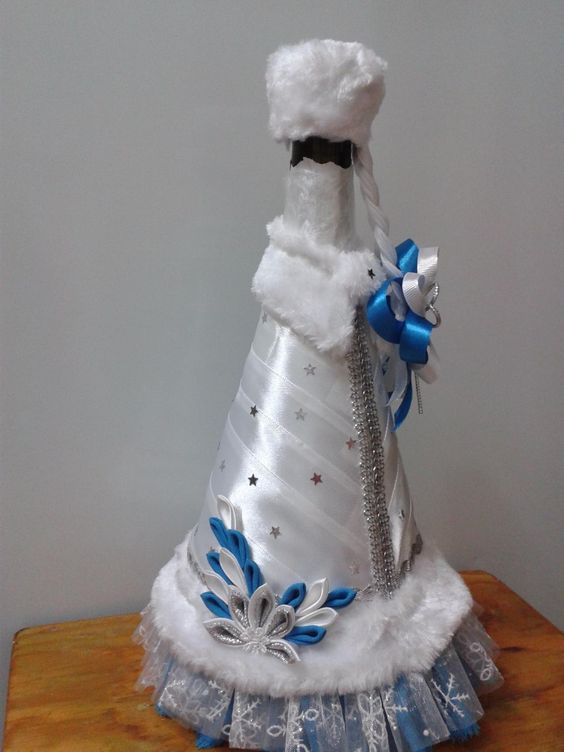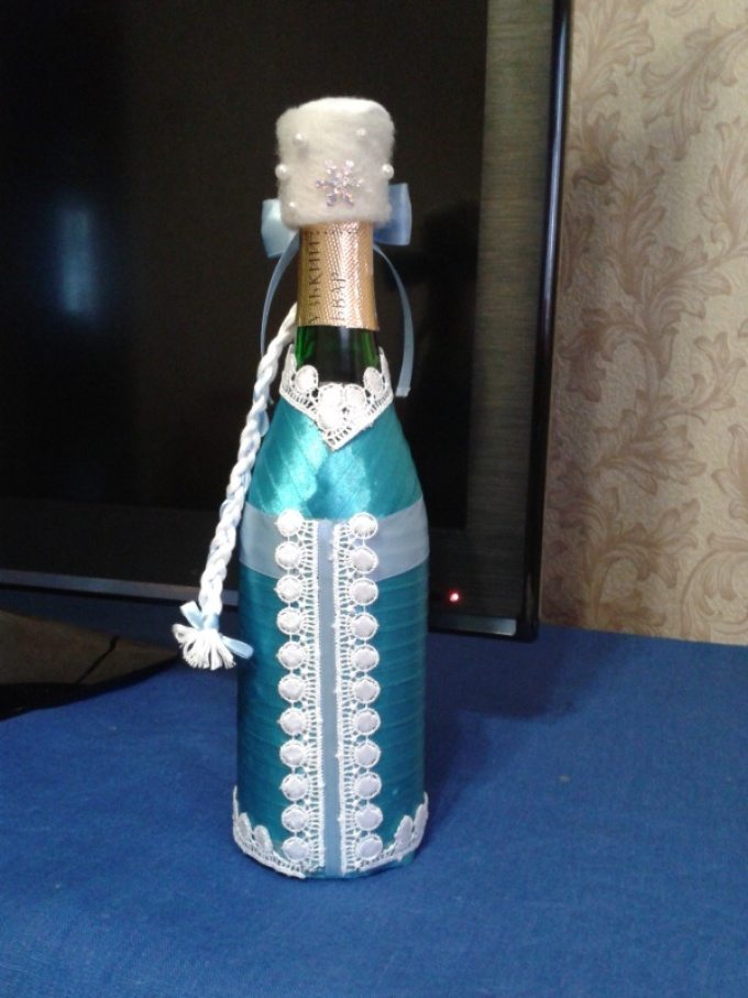 Quelles méthodes et quels matériaux ne sont pas utilisés lors de la création d'un chef-d'œuvre du Nouvel An à partir d'une bouteille de champagne. Les options les plus simples consistent à décorer la bouteille avec des guirlandes, des serpentins, des étincelles, de la ficelle, des rubans et bien plus encore. Pas besoin de réinventer la roue. Tout est pensé pour vous. Enveloppez simplement le matériau que vous voulez voir autour de la bouteille. Attachez-le et attachez un bel arc.Cette option de décoration est optimale et idéale pour une fête d'entreprise.