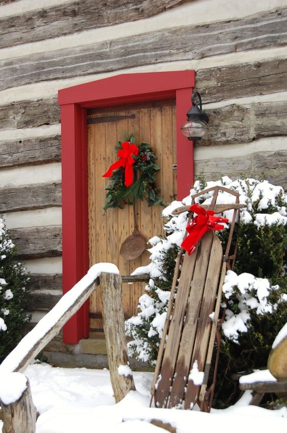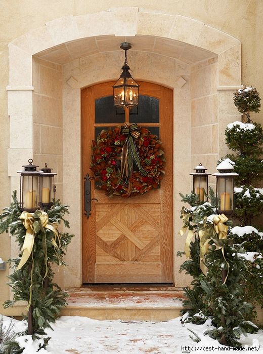Les portes de la maison entre les pièces sont très souvent suspendues avec des guirlandes de sapins de Noël ou de petites guirlandes de Noël. D'un côté, cela suffit, mais de l'autre, c'est banal, car la première chose que les clients sont venus voir, ce sont les portes. Il est préférable de les concevoir dans le même style que la pièce de la maison. Les portes intérieures décorées avec un énorme flocon de neige moelleux et des rubans de satin semblent inhabituelles. Les portes extérieures de la maison sont toujours décorées selon le principe résiduel: elles moulent tout ce qui n’est pas dommage. Mais en 2026, prenez cette question plus au sérieux: décorez les portes d'entrée avec une composition d'arbre de Noël, félicitations avec des inscriptions.
