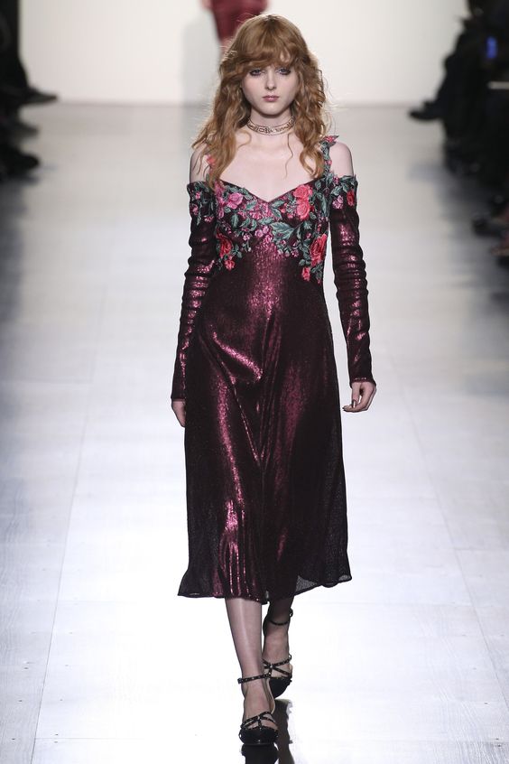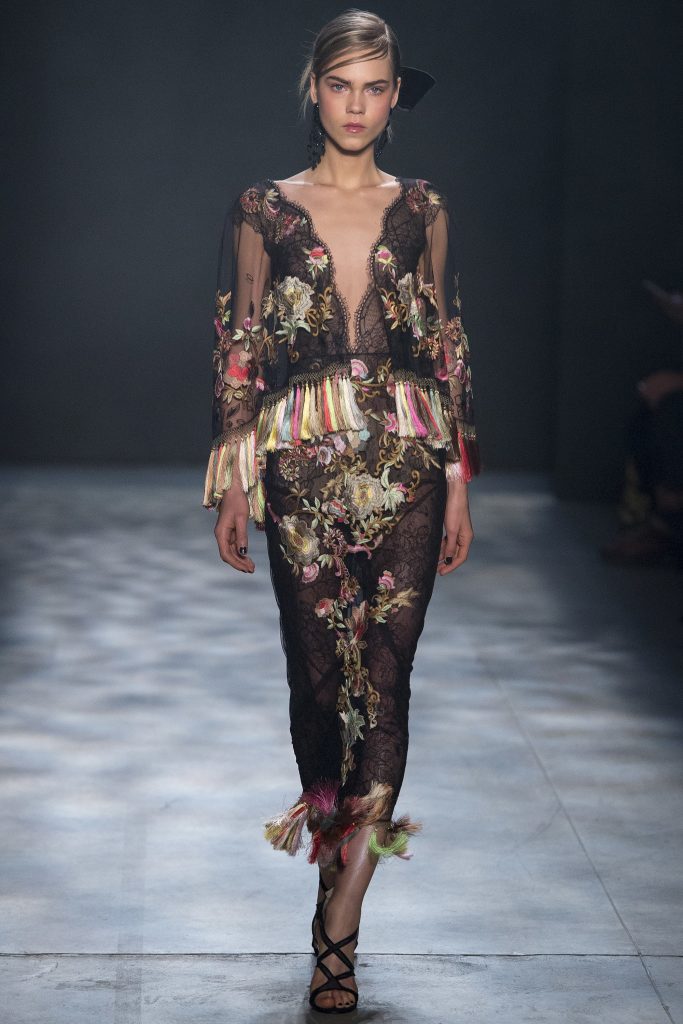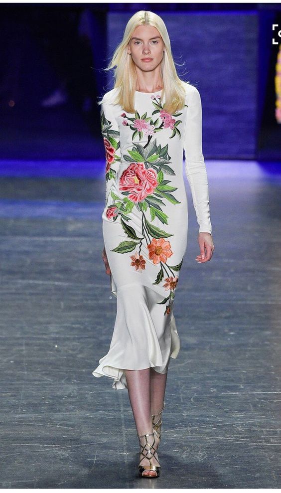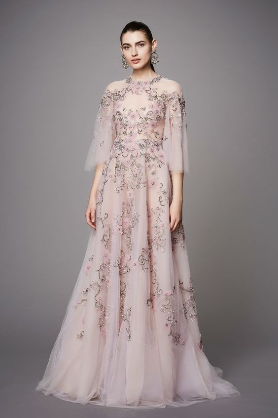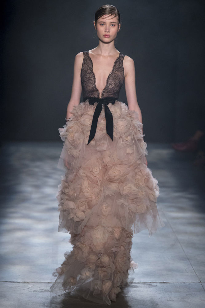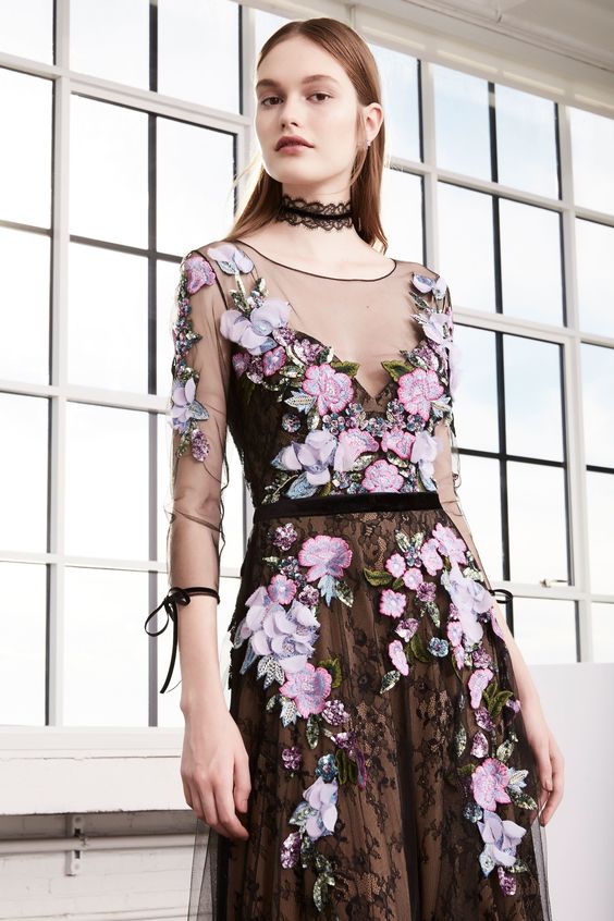 Les nouvelles collections de robes en organza transparent de Marchesa sont remplies de fleurs imprimées. Malgré la saison froide, la robe noire translucide du Nouvel An avec des ornements floraux est incroyablement belle.