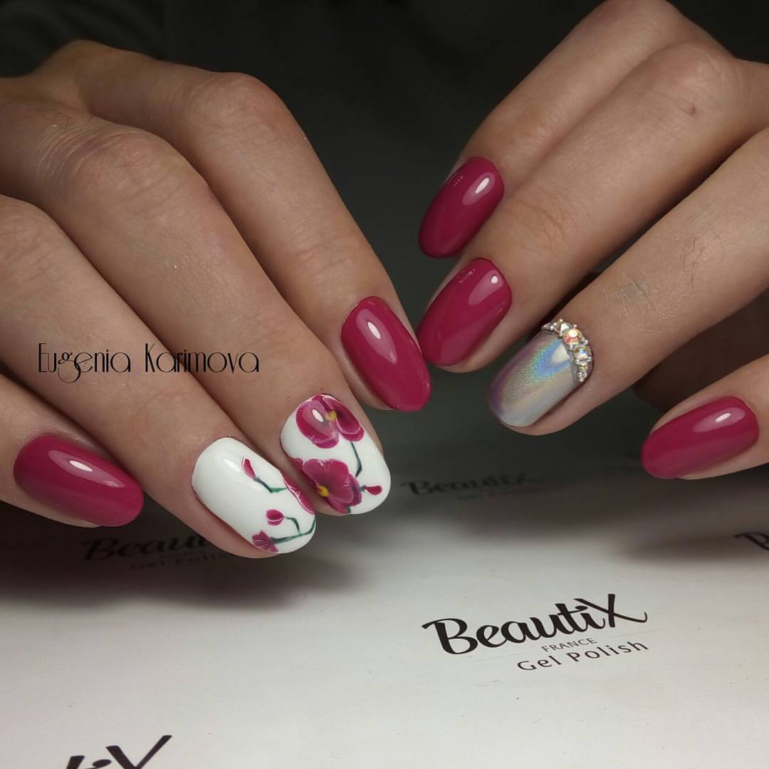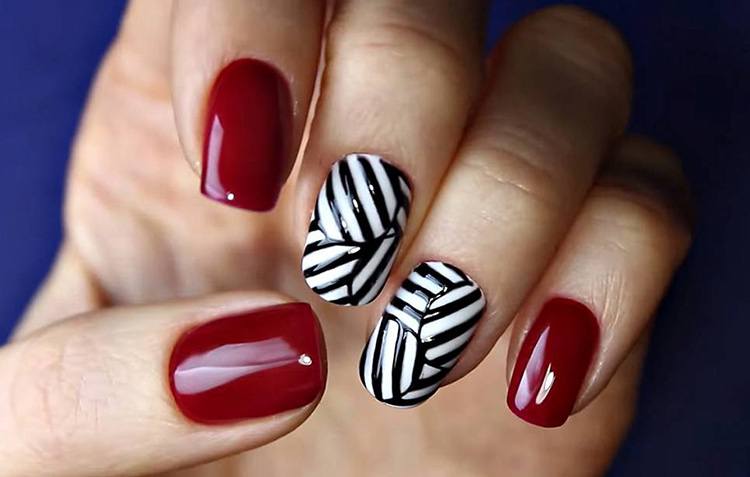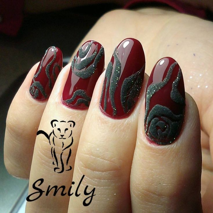 De beaux motifs complèteront toute manucure, cerise ne fait pas exception. Les motifs luxueux ont fière allure sur les ongles longs. Pour créer un beau dessin de manucure de cerise par un designer, une combinaison d'or, d'argent, de noir et de blanc est merveilleuse. Mais quel type de dessin mettre sur les ongles, dépend complètement de votre désir et de l'imagination du maître. Des motifs floraux, des ornements divers, des formes géométriques, un décor avec des strass, des pierres, des paillettes ou de la poudre auront fière allure. Les motifs peuvent être appliqués à tous les ongles et à un ou deux doigts.