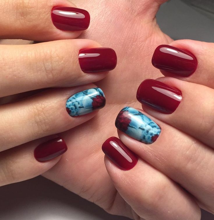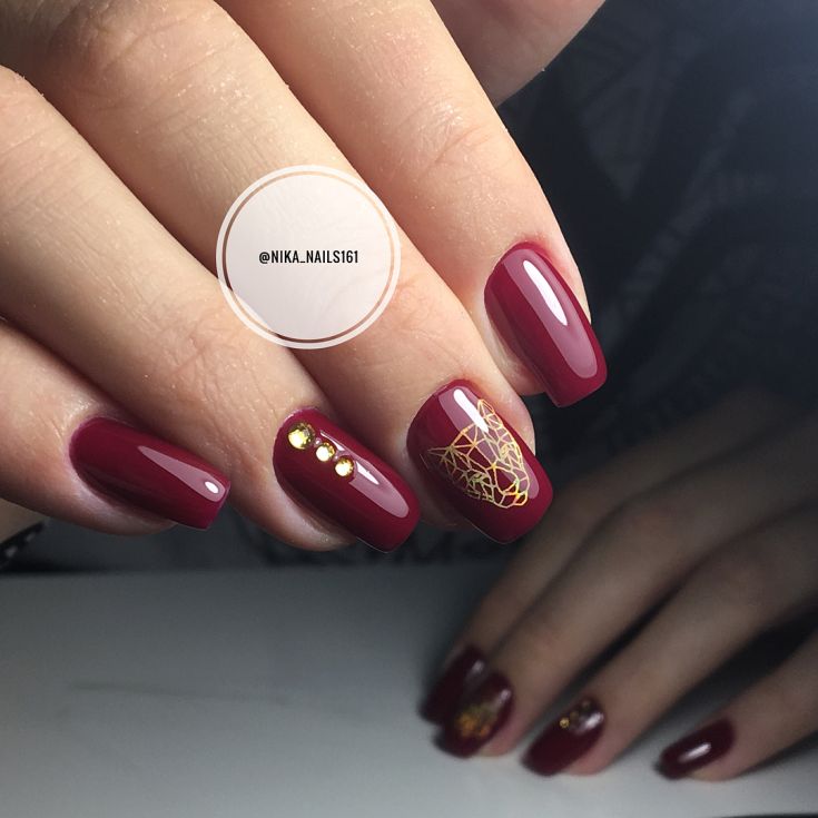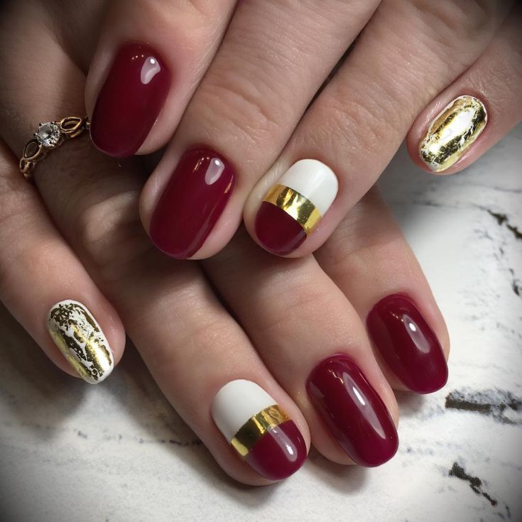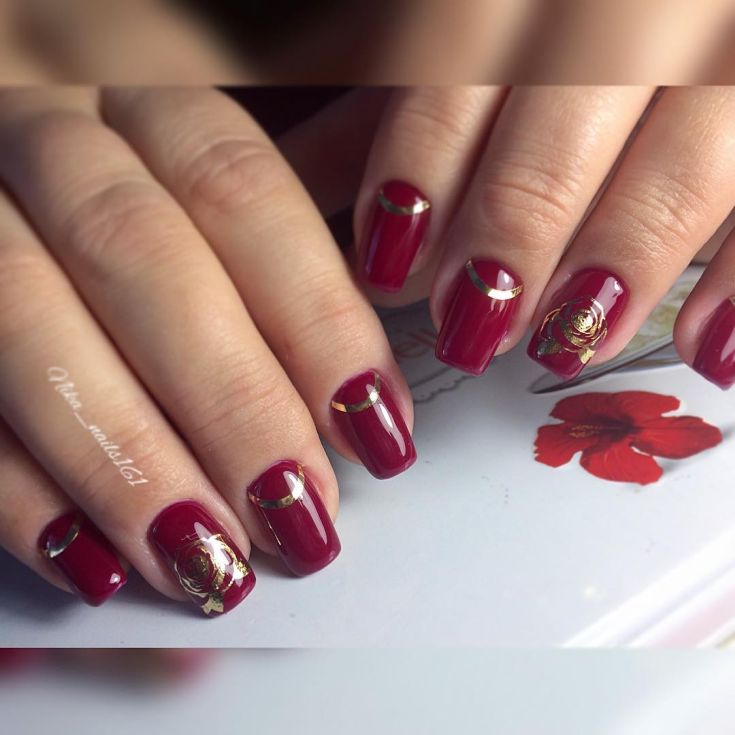 La combinaison la plus luxueuse et la plus belle dans la conception des ongles est considérée comme une manucure cerise-rubis avec de l'or. Bien avant la création du nail art, les bijoutiers utilisaient une telle combinaison spectaculaire dans la fabrication de bijoux en pierre rouge et en or. Pour créer un décor de manucure cerisier doré, il est préférable d’utiliser du papier d’aluminium permettant de réaliser de véritables chefs-d’œuvre sur les ongles. Le fond de cerise dense et riche permet à l'or d'apparaître et de se révéler au maximum. Chaque détail du motif doré ressortira clairement. Une bande de scotch dorée est idéale pour créer une belle manucure de cerise.