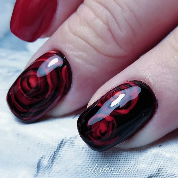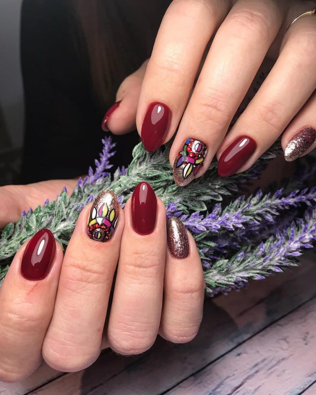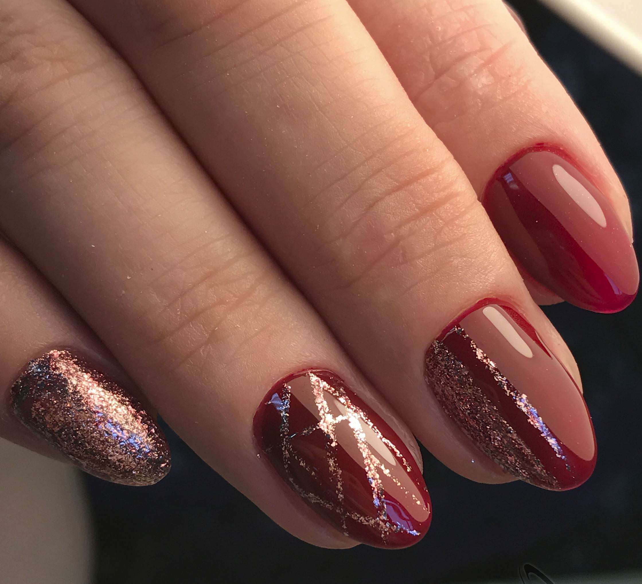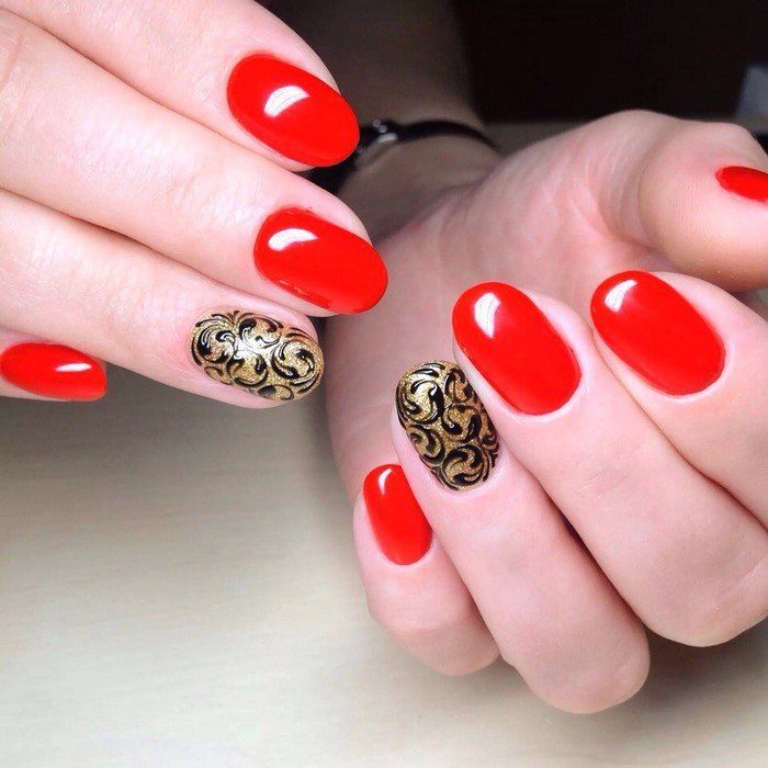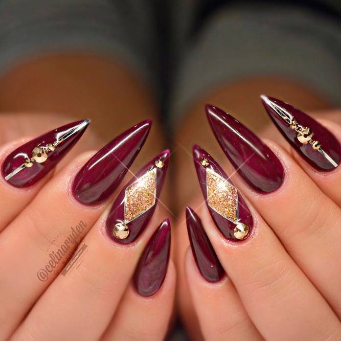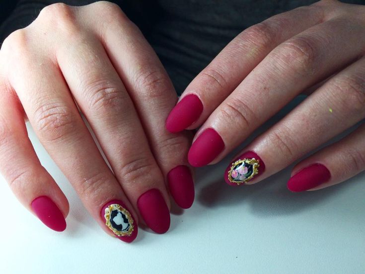 Dans le motif de brocart sur les ongles, on utilise généralement des détails dorés ou argentés, ce qui crée un motif attrayant. Le motif de brocart sur la manucure de cerise attire le regard, est magnifique et chic. En raison de la variété de motifs de brocart associés à la manucure de cerises, des compositions luxueuses et riches sont obtenues. Surtout si vous utilisez de l'or pour la peinture et du sable de velours pour créer une telle manucure. Après avoir choisi une nuance de cerise comme base de manucure, appliquez un motif de brocart doré et une manucure de luxe est prête. La manucure de brocart ressemble un peu à la culture des pays de l’Est, de la Perse, de la Chine et de l’Inde.