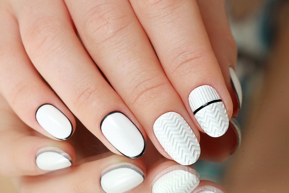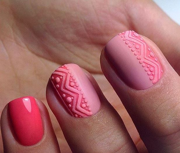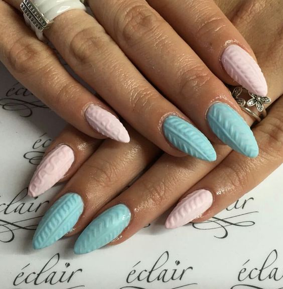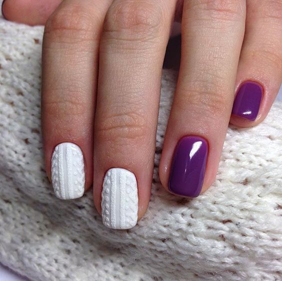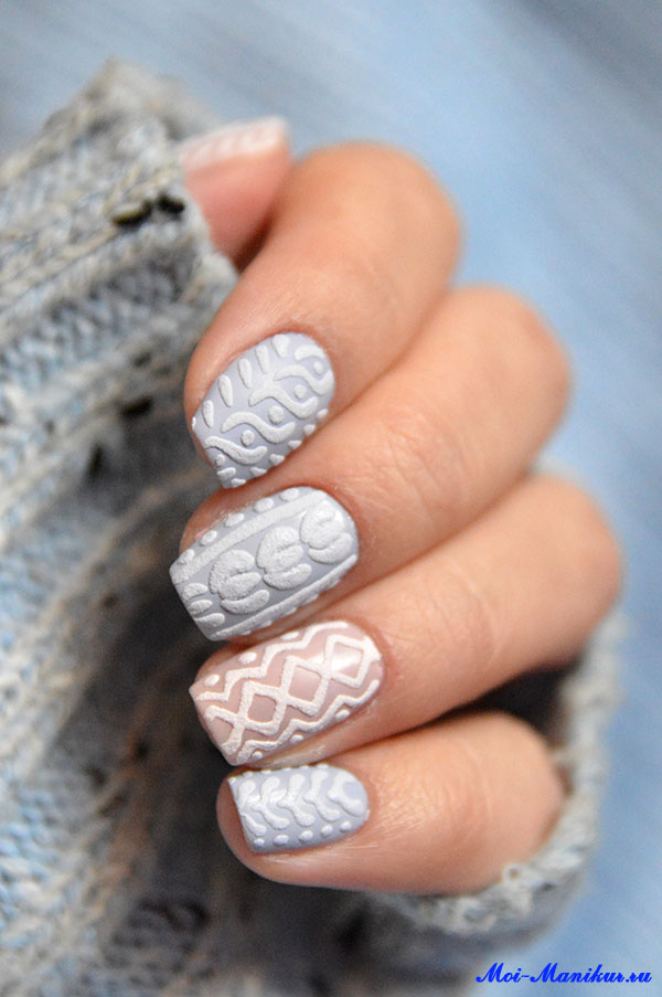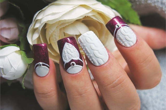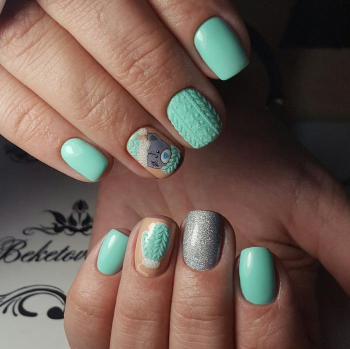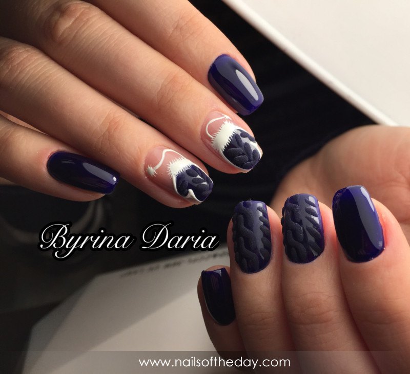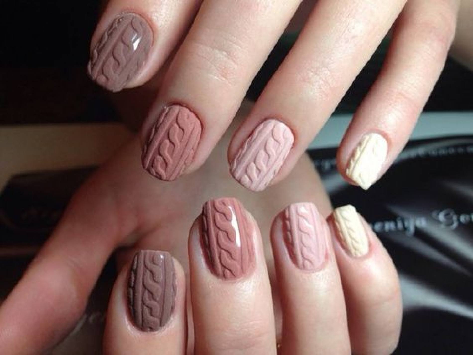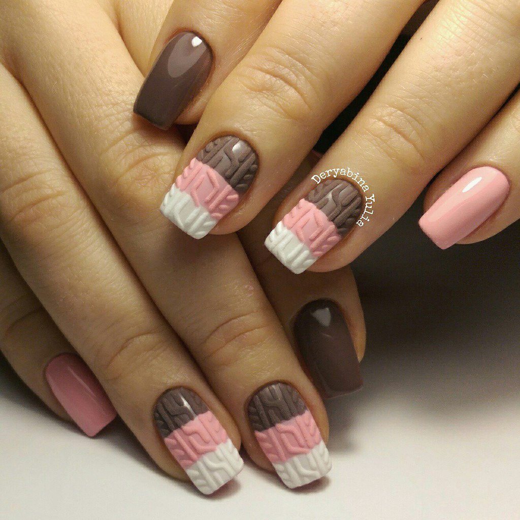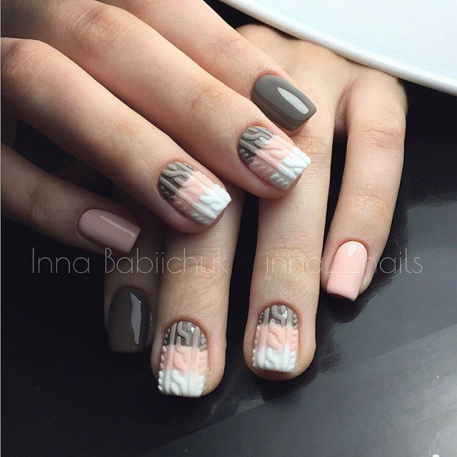 Un design tricoté à la mode peut être créé de différentes manières. Il peut être volumineux, ainsi que des motifs brillants. Les Maîtres conseillent fortement d’effectuer un motif similaire avec de la poudre acrylique. Cela donne un effet et une texture spéciaux. Il existe un très grand nombre d’options pour dessiner un motif de nattes, de points, de traits, etc. Vous avez juste besoin de saisir votre inspiration et de vous fier complètement à votre imagination.