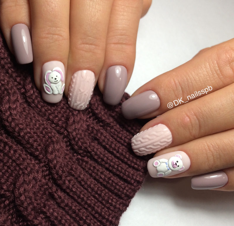 Ours en peluche - un type de motif qui est très commun en combinaison avec un style tricoté. Des artisans plus expérimentés décrivent des ours avec du vernis ou des peintures acryliques sans trop d'effort. Mais les débutants trouveront cette tâche impossible, car ce dessin est très petit et difficile à réaliser. Il est donc préférable d’utiliser des autocollants. Aujourd'hui, dans de nombreux magasins, vous pouvez acheter différentes diapositives adhésives avec des ours et tous les autres personnages de dessins animés qui auront fière allure en combinaison avec un motif tricoté. Cette option de manucure a l’air très séduisante et mignonne.