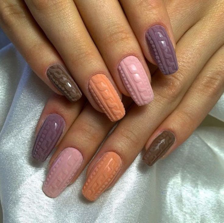 Pour les filles qui préfèrent des couleurs plus vives, cette année, il n'y a pas de frontières. Vous pouvez facilement combiner plusieurs couleurs différentes. Les motifs tricotés multicolores sont très attrayants. Pour donner un effet de velours, il convient d'ajouter de la poudre acrylique. En 2026, vous ne pourrez plus vous passer des paillettes de paillettes ou de quelques strass laconiques. La combinaison de lait, de chocolat, de rouge et de blanc, de pêche et de gris, de bleu, de bleu et de blanc et de gel pour gel dans un nail art tricoté est parfaite.