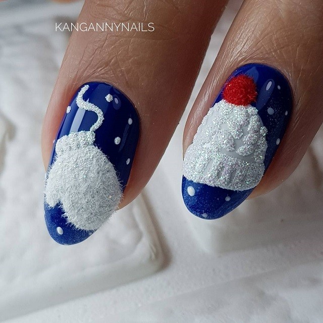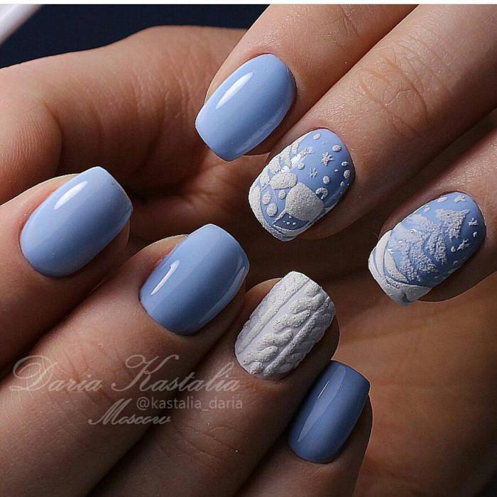 Le design du «pull» est considéré sans équivoque comme un hiver, raison pour laquelle il a l'air sophistiqué et spectaculaire avec ses flocons de neige volumineux parsemés d'étincelles ou de poudre. Pour la vie de tous les jours, une manucure française transparente avec des éléments de flocons de neige blancs est une excellente option. L’annuaire se distingue par un volumineux motif tricoté. Un tel nail art est le plus souvent réalisé dans des couleurs pastel ou bleues et blanches.
