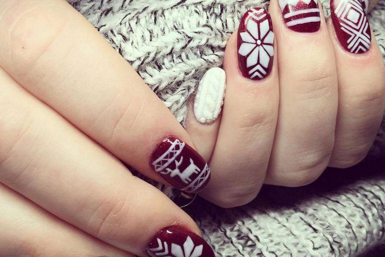 Le design tricoté est très bien combiné avec des flocons de neige, des ornements et des cerfs du style scandinave.Une telle manucure implique exclusivement des couleurs gris-brun ou rouge-blanc. Pour tracer un flocon de neige scandinave aux contours plus nets et plus précis, il est préférable d'effectuer un marquage de point préliminaire. Ensuite seulement, connectez-les avec des lignes fines et soignées et peignez complètement avec la couleur principale. L'alternance d'un motif tricoté avec un ornement scandinave, complété par des points et d'autres motifs géométriques, a fière allure.