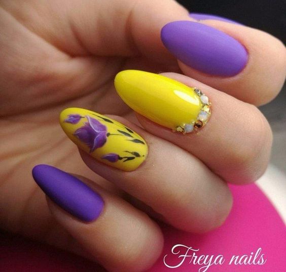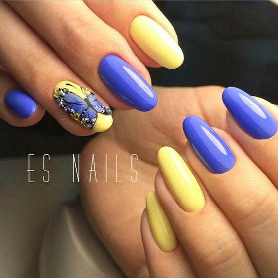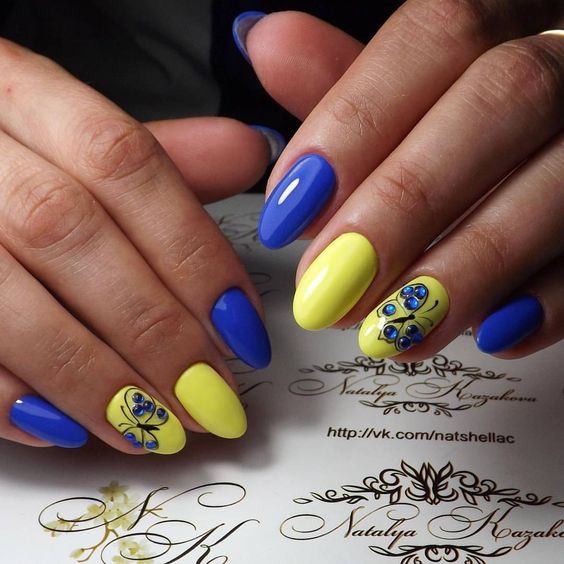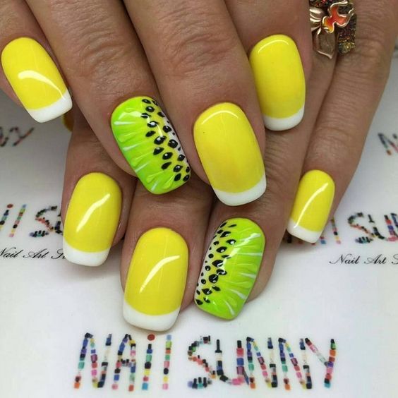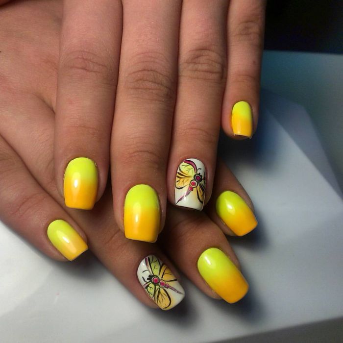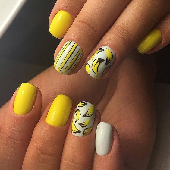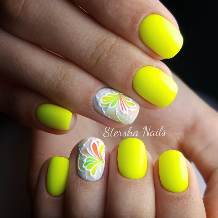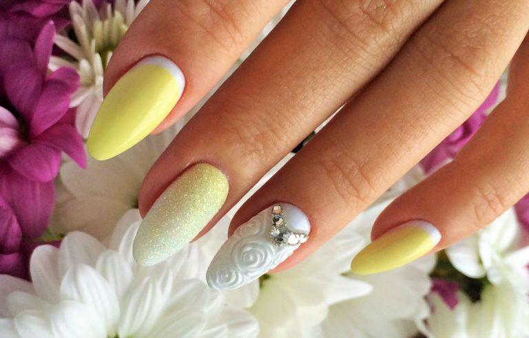 La combinaison de jaune et de blanc est toujours particulièrement belle et ensoleillée. Par conséquent, en été - c'est l'une des options les plus populaires pour la manucure. Mais néanmoins, cela ne signifie pas que vous ne devriez pas utiliser de décor supplémentaire. Les petits strass sont la meilleure décoration. Cependant, une excellente solution serait un dessin sur un ou deux clous.