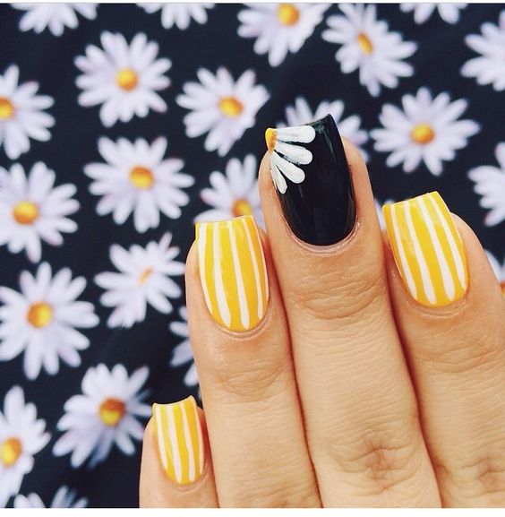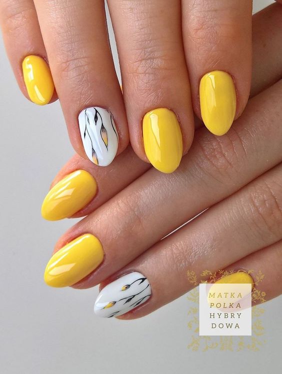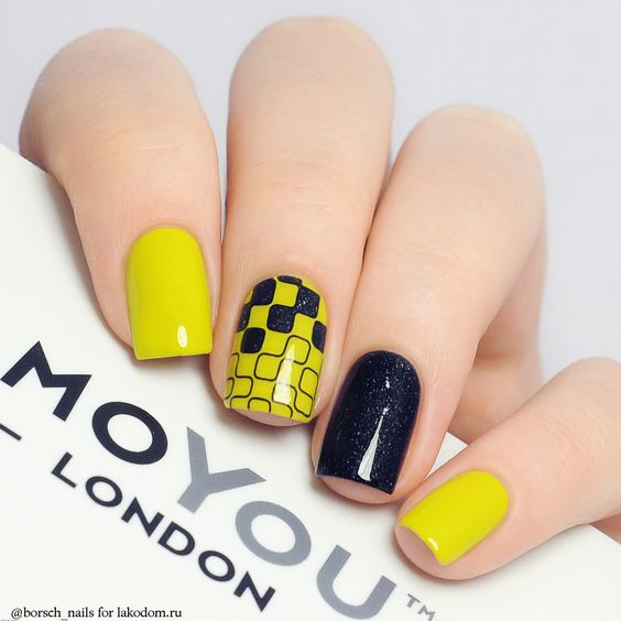 Pour créer une manucure brillante et efficace, vous devez choisir les bonnes couleurs. La combinaison du noir et du jaune est parfaite pour cela. Mais en fonction de la nuance de jaune, vous pouvez rendre le dessin à la fois léger, délicat, du soir ou même strict. Bien sûr, le rôle est joué par un décor supplémentaire, ainsi que par la présence d'un motif sur les ongles.