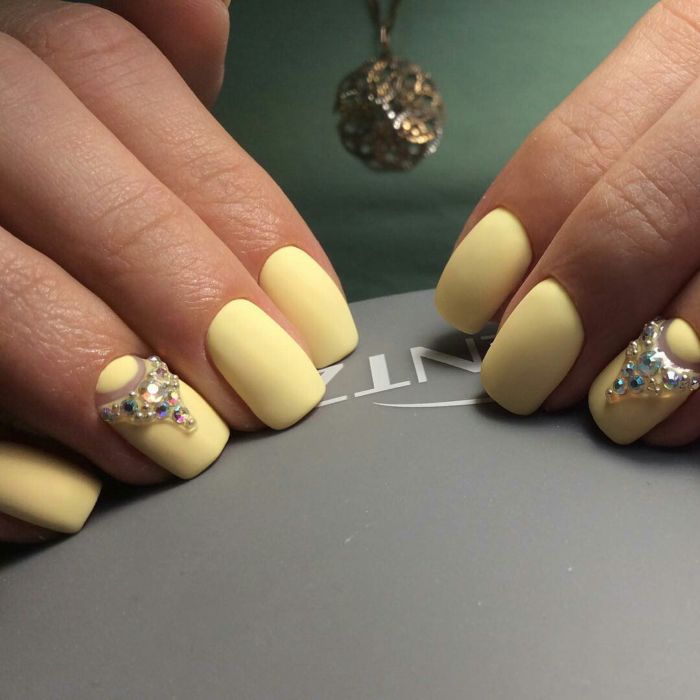La couleur jaune a fière allure sur les ongles, pas seulement sous la forme brillante habituelle. La finition mate est exactement ce sur quoi vous devriez porter une attention particulière en 2026. Si vous le souhaitez, il peut être décoré de strass, d’un petit motif de style géométrique ou de fleurs. Choisissez l'option la plus attrayante pour vous-même.