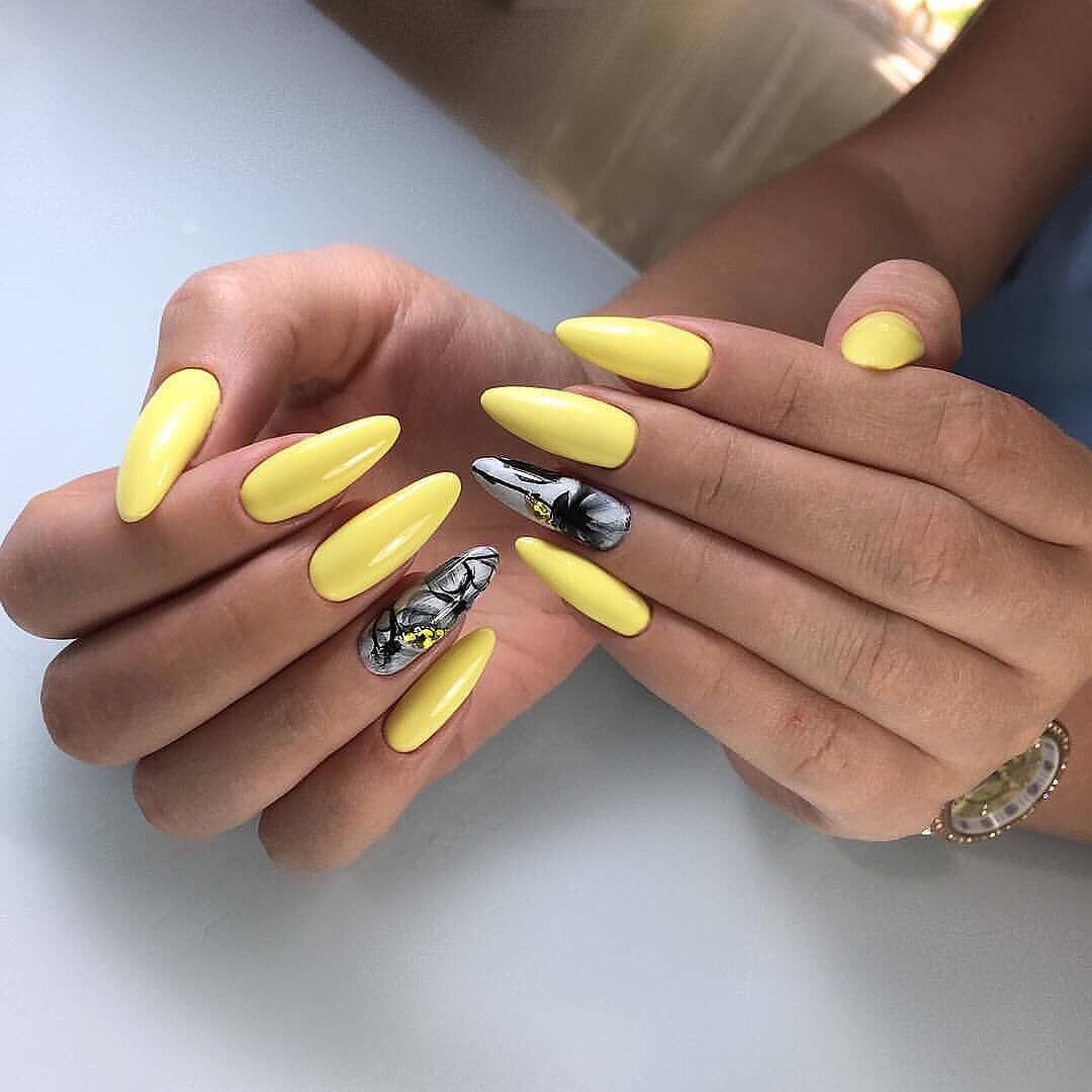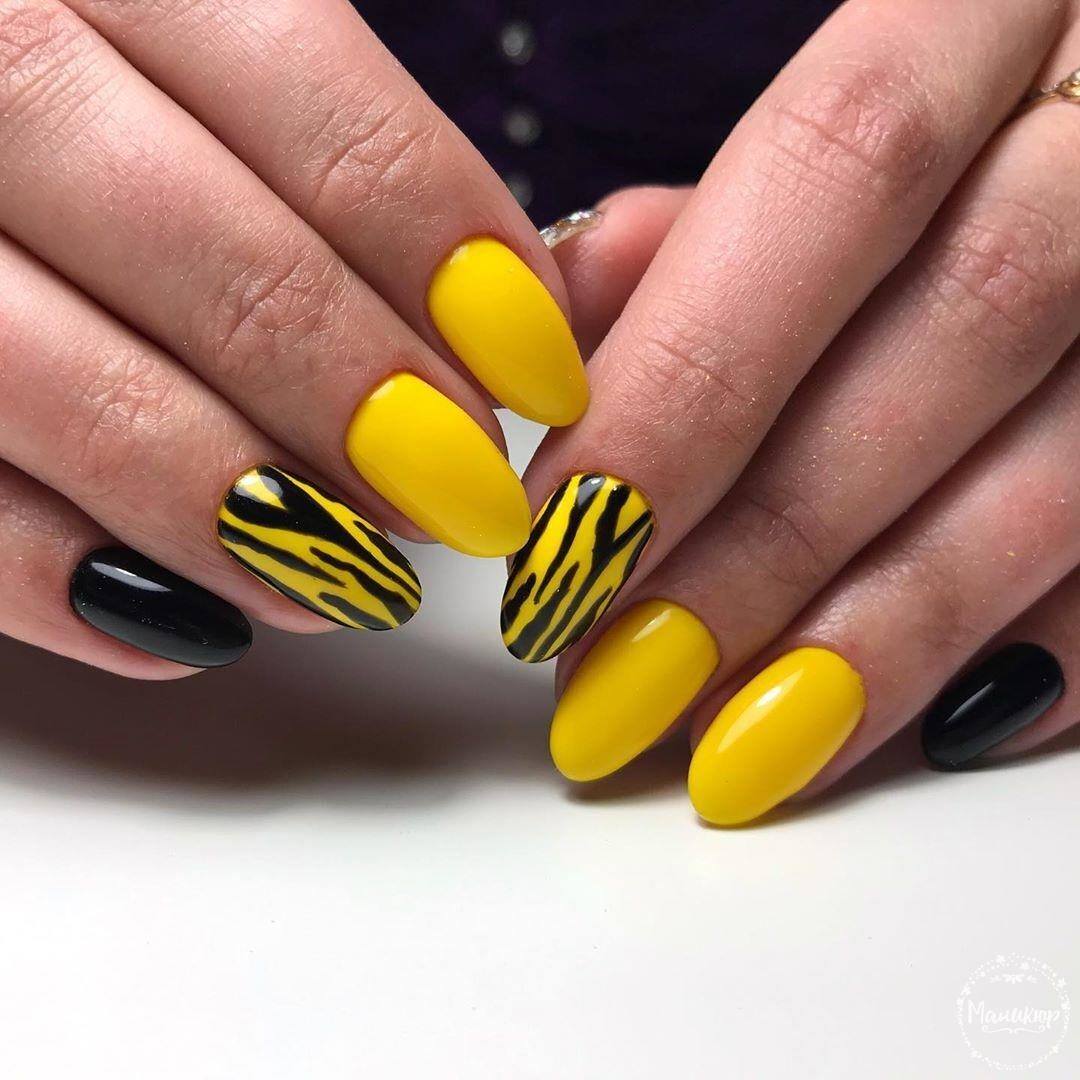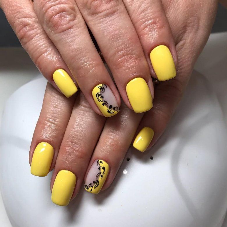 Tout d'abord, pour effectuer une manucure spectaculaire, vous devez choisir le bon ton. La combinaison du noir et du jaune est parfaite. Selon le ton du jaune, vous pouvez réaliser un dessin doux, austère, léger ou du soir. Un décor important, la présence de dessins et leur style jouent un rôle important. Le plus souvent, un tel nail art est choisi pour la période automnale. Cela est dû au fait qu'il s'intègre parfaitement dans la garde-robe de la saison. En ce qui concerne le motif, choisissez une dentelle raffinée, des fleurs délicates ou un motif géométrique à la mode. Chacune des options donnera un certain caractère à la manucure.